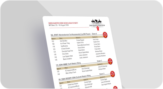 33 SWISS QUARTER HORSE SHOW & SQHA FUTURITY NPZ Bern / 23. – 24. August 2025 168. JPHMT: Weinlandschule Trail-Horsemanship Cup (50% Payout) Shown: 8 Back # Pferd Reiter/in Besitzer/in 103 Aint She Blue Viviane Naegeli Heinz Huber 108 Its A Power Thing Sophie Gillioz Sophie Gillioz 118 DarkParadise Denise Bachmann-Streuli Corinne Stern 123 A Smart Smoker Alessia Fahrni Priska Fahrni 124 Chocolate Sugar Free Selina Fahrni Priska Fahrni 130 Dirty Dallas Muriel Sophie Rotzer Monique Rotzer 140 Love Signed In Red Linda Johansson Jacqueline Wunderer 145 Blacks Invitation Linda Johansson Jacqueline Wunderer 174. AQHA 436000: Youth Western Riding Shown: 2 Back # Pferd Reiter/in Besitzer/in 126 GC ImpressionOfLove Ayla Schleiniger Jonas M Schleiniger 149 Whiz A Royal Touch Muriel Sophie Rotzer Monique Rotzer 181. SQHA GDSQWR: SQHA Graduate Western Riding Shown: 3 Back # Pferd Reiter/in Besitzer/in 121 Huntin Lazy Dreams Corinne Gygax Corinne Gygax 126 GC ImpressionOfLove Ayla Schleiniger Jonas M Schleiniger 146 Suddenly A Dark Chip Manuela Witt Sara Hoppler-Morges 183*. SQHA FUSQRN: SQHA Futurity Reining Shown: 2 Back # Pferd Reiter/in Besitzer/in 109 Made For Loving Erika Braun Erika Braun 147 Miss Cee Spook Nadine Rindlisbacher Nadine Rindlisbacher 184.* SQHA GDSQRN: SQHA Graduate Reining Shown: 1 Back # Pferd Reiter/in Besitzer/in 150 WhizaSailingGump BB Rita Froelicher Rita Froelicher * Die Futurity und Graduate Reining Klassen werdenim Rahmen der NRHA Fall Show/SM Reining in Moolargue ausgetragen. Wasser mit Pfefferrminztee und etwas Apfelessig verdünnt hat eine kühlende Wirkung, lindert Juck- reiz und hält die Insekten für einen Moment fern. ZUM PATTERN ZUM PATTERN ZUM PATTERN ZUM PATTERN ZUM PATTERN ZUM PATTERN ZUM PATTERN ZUM PATTERN ZUM PATTERN ZUM PATTERN