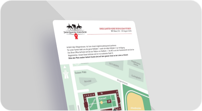 4 SWISS QUARTER HORSE SHOW & SQHA FUTURITY NPZ Bern / 23. – 24. August 2025 29 Boxen Besammlungsplatz WC Tribüne PKW Trailer Trailer Anfahrt über Mingerstrasse. Auf dem Areal möglichst platzsparend parkieren. Für unser Turnier steht uns die ganze Reitbahn 1 sowie die halbe Reitbahn 2 zur Verfügung. Das Show Office befindet sich bei der Tribüne von Reitbahn 1. Die WC’s und die Festwirtschaft sind bei der Wagenremise. Unsere Boxen befinden sich im rot markierten Stall 29. Bitte den Platz sauber halten! Hunde sind auf dem ganzen Areal an der Leine zu führen!