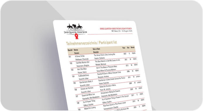 34 SWISS QUARTER HORSE SHOW & SQHA FUTURITY NPZ Bern / 23. – 24. August 2025 Teilnehmerverzeichnis / Participant list Back# Horse Sire x Dam Year Sex Breed Owner Breeder 101 A Great Strike The Great Chief x Only Inviting Me 2022 G AQHA Wellauer; Chantale Hoehn; Stefanie 102 Call Me Martini Girl The Best Martini x Call Me Cause Im Hot 2021 M AQHA Heizmann; Brigitte Middel; Michael 103 Aint She Blue Aint It The Blues x Pleasure Mary 2012 M AQHA Huber; Heinz Gesa Meier & Thomas Bidmon 104 CalDoubleSnap Double R Chant x Missy Snapper Cody 2008 M AQHA Koechli; Lilian Bergese; Andrea 105 Gentlemans Baily V Gentleman x Celtic Fields Sonata For Patton 2011 M andere Koechli; Lilian Voser; Gabriela 106 Uranie de Perriere Dalas De Champs x Nikita 2008 M andere Koechli; Lilian Noir; M. Jeremy 107 Expected Miss Lea Unxpected x Riding On Dreams 2020 M AQHA Haeberlin; Ms Madeleine Haeberlin; Ms Madeleine 108 Its A Power Thing Its A Southern Thing x Power In The Canyon 2017 G AQHA Gillioz; Sophie Gillioz; Sophie 109 Made For Loving Pale Face Dunnit x Pine Finest Jewel 2019 M AQHA Braun; Erika Scheunemann; Claudia 110 My Midnight Romeo My Rods Chipped x KM Its All About Me 2020 S AQHA Gafner; Sibylle Schmid; Andrea 111 My Midnight Angel My Midnight Romeo x Kachiing 2025 S AQHA Remund; Sandra Remund; Sandra 112 Hesa Midnight Magic My Midnight Romeo x Miss Zippos Finale 2025 S AQHA Remund; Sandra Remund; Sandra 113 Midnight Sweeetness My Midnight Romeo x Kachiing 2024 M AQHA Remund; Sandra Remund; Sandra 114 Zips Last Encore Zip Chip Leaguer x Encore Invitation 2014 G AQHA Zaugg; Anne 115 Makin Happy Sunsets Makin Me Willy Wild x A Good Sunset 2025 S AQHA Schorno; Pia Schorno; Pia 116 RK Royally Blue Sky Aint It The Blues x Good For The Keeping 2023 G AQHA Schaellibaum; Jasmin Brehsan; Jana 117 BluesGoodInvitation Aint It The Blues x OnlyInviteGoodGirls 2019 G AQHA Stern; Corinne Gesa Meier & Thomas Bidmon