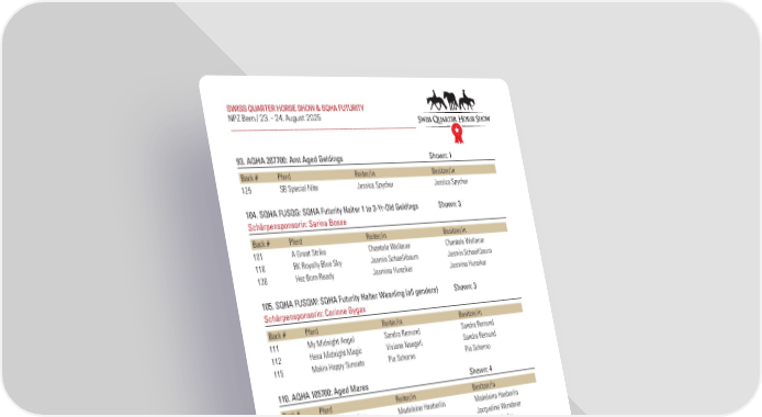 27 SWISS QUARTER HORSE SHOW & SQHA FUTURITY NPZ Bern / 23. – 24. August 2025 93. AQHA 207700: Amt Aged Geldings Shown: 1 Back # Pferd Reiter/in Besitzer/in 129 SB Special Nite Jessica Spycher Jessica Spycher 104. SQHA FUSQG: SQHA Futurity Halter 1 to 3-Yr-Old Geldings Shown: 3 Schärpensponsorin: Sarina Bosse Back # Pferd Reiter/in Besitzer/in 101 A Great Strike Chantale Wellauer Chantale Wellauer 116 RK Royally Blue Sky Jasmin Schaellibaum Jasmin Schaellibaum 136 Hez Born Ready Jasmina Hunziker Jasmina Hunziker 105. SQHA FUSQW: SQHA Futurity Halter Weanling (all genders) Shown: 3 Schärpensponsorin: Corinne Gygax Back # Pferd Reiter/in Besitzer/in 111 My Midnight Angel Sandra Remund Sandra Remund 112 Hesa Midnight Magic Viviane Naegeli Sandra Remund 115 Makin Happy Sunsets Pia Schorno Pia Schorno 110. AQHA 105700: Aged Mares Shown: 4 Back # Pferd Reiter/in Besitzer/in 107 Expected Miss Lea Madeleine Haeberlin Madeleine Haeberlin 140 Love Signed In Red Linda Johansson Jacqueline Wunderer 142 My Great Chocolate Karin Maurhofer Karin Maurhofer 148 Scande My Name Elodie Bays Elodie Bays 112. AQHA 175000: Performance Halter Mares Shown: 2 Back # Pferd Reiter/in Besitzer/in 121 Huntin Lazy Dreams Corinne Gygax Corinne Gygax 122 Shezz Got The Look Nadine Strohbach Nadine Strohbach 119. AQHA 205700: Amt Aged Mares Shown: 2 Back # Pferd Reiter/in Besitzer/in 102 Call Me Martini Girl Jael Heizmann Brigitte Heizmann 134 Stellar Mechanic Martina Huggler Martina Huggler