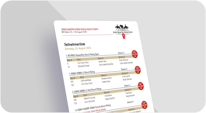 15 SWISS QUARTER HORSE SHOW & SQHA FUTURITY NPZ Bern / 23. – 24. August 2025 Teilnehmerliste Samstag, 23. August 2025 1. RO RRIO: Rasseoffen Ranch Riding Open Shown: 2 Back # Pferd Reiter/in Besitzer/in 6 A Lil Hucci Gucci Sandra Haas Ruedi Zihlmann 15 Roche By Chanel Carla Isabelle Spoelder Carla Isabelle Spoelder 1. AQHA 143004: L1 Ranch Riding Shown: 2 Back # Pferd Reiter/in Besitzer/in 104 CalDoubleSnap Rowena Koechli Lilian Koechli 120 A Lil Hucci Gucci Sandra Haas Ruedi Zihlmann 2. AQHA 243002: L1 Amt Ranch Riding Shown: 2 Back # Pferd Reiter/in Besitzer/in 109 Made For Loving Erika Braun Erika Braun 131 Cool Cody Lena Nadja Schmidli Nadja Schmidli 6. SQHA FUSQRR: SQHA Futurity Ranch Riding Shown: 5 Schärpensponsor: Smart Horse Stable Back # Pferd Reiter/in Besitzer/in 107 Expected Miss Lea Madeleine Haeberlin Madeleine Haeberlin 109 Made For Loving Erika Braun Erika Braun 110 My Midnight Romeo Sandra Remund Sibylle Gafner 135 Xena Doc Wyo Nastassja Russo Nastassja Russo 147 Miss Cee Spook Nadine Rindlisbacher Nadine Rindlisbacher 7. AQHA 443000: Youth Ranch Riding Shown: 2 Back # Pferd Reiter/in Besitzer/in 104 CalDoubleSnap Rowena Koechli Lilian Koechli 149 Whiz A Royal Touch Muriel Sophie Rotzer Monique Rotzer 8. CIC QARR1: AQHA / NSBA Amateur Ranch Riding All Ages Shown: 3 Back # Pferd Reiter/in Besitzer/in 120 A Lil Hucci Gucci Sandra Haas Ruedi Zihlmann 129 SB Special Nite Jessica Spycher Jessica Spycher 131 Cool Cody Lena Nadja Schmidli Nadja Schmidli ZUM PATTERN ZUM PATTERN ZUM PATTERN ZUM PATTERN ZUM PATTERN ZUM PATTERN ZUM PATTERN ZUM PATTERN ZUM PATTERN ZUM PATTERN ZUM PATTERN ZUM PATTERN