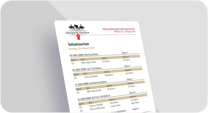 26 SWISS QUARTER HORSE SHOW & SQHA FUTURITY NPZ Bern / 23. – 24. August 2025 Teilnehmerliste Sonntag, 24. August 2025 66. AQHA 103000: Weanling Stallions Shown: 1 Back # Pferd Reiter/in Besitzer/in 115 Makin Happy Sunsets Pia Schorno Pia Schorno 68. AQHA 103200: Two Yr Old Stallions Shown: 1 Back # Pferd Reiter/in Besitzer/in 125 Dunits Lou Starlight Sarina Bosse Sarina Bosse 74. AQHA 203000: Amt Weanling Stallions Shown: 1 Back # Pferd Reiter/in Besitzer/in 115 Makin Happy Sunsets Pia Schorno Pia Schorno 76. AQHA 203200: Amt Two Yr Old Stallions Shown: 2 Back # Pferd Reiter/in Besitzer/in 125 Dunits Lou Starlight Sarina Bosse Sarina Bosse 139 HW Dun It Whiz Spook Jennifer Andres Agata Olejnik 82. SQHA FUSQS: SQHA Futurity Halter 1 to 3-Yr-Old Stallions Shown: 2 Schärpensponsorin: Cherise Hollenstein Back # Pferd Reiter/in Besitzer/in 125 Dunits Lou Starlight Sarina Bosse Sarina Bosse 139 HW Dun It Whiz Spook Jennifer Andres Agata Olejnik 86. AQHA 107700: Aged Geldings Shown: 1 Back # Pferd Reiter/in Besitzer/in 130 Dirty Dallas Muriel Sophie Rotzer Monique Rotzer 92. AQHA 207600: Amt Three Yr Old Geldings Shown: 1 Back # Pferd Reiter/in Besitzer/in 101 A Great Strike Chantale Wellauer Chantale Wellauer