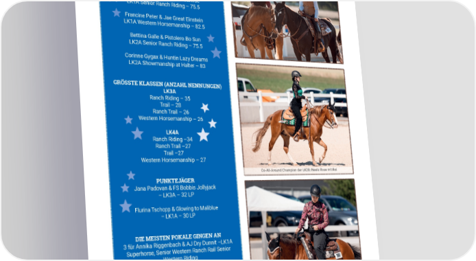 SWRA SPORT FACTS & FIGURES HIGH SCORES Karin Ochsner & HB Little Sunrise LK1A Senior Ranch Riding – 75.5 Francine Peter & Jae Great Einstein LK1A Western Horsemanship – 82.5 Bettina Galle & Pistolero Bo Sun LK2A Senior Ranch Riding – 75.5 Corinne Gygax & Huntin Lazy Dreams LK2A Showmanship at Halter – 83 GRÖSSTE KLASSEN (ANZAHL NENNUNGEN) LK3A Ranch Riding – 35 Trail – 28 Ranch Trail – 26 Western Horsemanship – 26 LK4A Ranch Riding –34 Ranch Trail –27 Trail –27 Western Horsemanship – 27 Co-All-Around Champion der LK2B: Neela Rose mit Roi PUNKTEJÄGER Jana Padovan & FS Bobbis Jollyjack – LK3A – 32 LP Flurina Tschopp & Glowing to Maliblue – LK1A – 30 LP DIE MEISTEN POKALE GINGEN AN 3 für Annika Riggenbach & AJ Dry Dunnit –LK1A Superhorse, Senior Western Ranch Rail Senior Western Riding 3 für Alessia Fahrni & A Smart Smoker – LK4B Western Horsemanship, Western Ranch Rail, Ranch Riding Co-All Around Champion LK2B: Selina Fahrni und Bops Strudel Pepper 5555