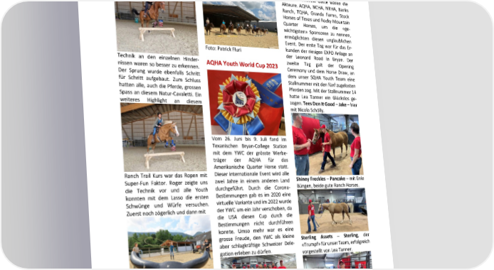 Hierzu ist ein Bild mit allen Youth aus 500 internationale Gäste waren die Sprung, die Linienführung und die Save the Date! den laufenden Trainings zum YWC Akteure. AQHA, NCHA, NRHA, Banks entstanden. Ranch, TQHA, Granda Farms, Stock 18. – 21. Mai 2023 Horses of Texas und Rocky Mountain Horsemanship Camp Quarter Horses, um die «ge- Matzendorf wichtigsten» Sponsoren zu nennen, ermöglichten diesen unglaublichen 26. Juni – 8. Juli 2023 Event. Der erste Tag war für das Er- Youth World Cup, Bryan, TX Foto: Patrick Fluri kunden der riesigen EXPO Anlage an der Leonard Road in Bryan. Der 21. - 23. Juli 2023 Technik an den einzelnen Hinder- zweite Tag galt der Opening Die sechs Jugendlichen haben seit AQHA Youth World Cup 2023 SM Western, Roggwil nissen waren so besser zu erkennen. Ceremony und dem Horse Draw, an dem November 2022 bis zur heutigen dem unser SQHA Youth Team eine Der Sprung wurde ebenfalls Schritt Anlässlich der SQHA GV wurde dieses SQHA GV einen unglaublichen Spurt 04. - 13. August 2023 für Schritt aufgebaut. Zum Schluss Stallnummer mit den fünf zugelosten Bild amerikanisch versteigert und für die YWC-Kasse hingelegt. Dieses FEQHA European Championship, hatten alle, auch die Pferde, grossen Pferden zog. Mit der Stallnummer 14 brachte der Youth-Kasse für den YWC Engagement mit dem Youth Stand Kreuth Spass an diesem Natur-Cavaletti. Ein hatte Lea Tanner ein Glückslos ge- 270.- ein. geht nun weiter zum Warm-up in zogen.Tees Dun It Good –Jake – hier weiteres Highlight an diesem Zum zweiten wird von jedem Team Holziken und an diverse andere 16. + 17. September 2023 Anlässe. mit Nicola Schölly. ein AQHA-YWC-Scrapbook verlangt. Auf diesem Weg herzlichen Dank an SQHA Futurity + Swiss Quarter Horse Dieses Tagebuch zu unserer YWC- alle Sponsoren, Gönner und Show, Matzendorf Geschichte muss wiederum digital Spenden, die in den vergangenen auf einen bestimmten Termin Vom 26. Juni bis 9. Juli fand im abgegeben werden und darf fünf Wochen in unsere Youth-Kasse Texanischen Bryan-College Station Minuten nicht überschreiten. Die gegeben wurden. dritte Aufgabe ist ein Lip-Sync- mit dem YWC der grösste Werbe- träger der AQHA für das Contest, eine Präsentation zu einem Wir sind sehr stolz, dass wir für die Amerikanische Quarter Horse statt. Lied mit persönlicher Note aus dem SQHA am Youth World Cup teil- Ranch Trail Kurs war das Ropen mit Dieser internationale Event wird alle eigenen Land. Hierzu wurde bereits nehmen dürfen. Shiney Freckles – Pancake – mit Enie Super-Fun Faktor. Roger zeigte uns zwei Jahre in einem anderen Land geprobt. durchgeführt. Durch die Corona- Büngen, beide gute Ranch Horses. die Technik vor und alle Youth Yolanda Facchin konnten mit dem Lasso die ersten Bestimmungen gab es im 2020 eine Schwünge und Würfe versuchen. virtuelle Variante und im 2022 wurde Zuerst noch zögerlich und dann mit der YWC um ein Jahr verschoben, da die USA diesen Cup durch die Bestimmungen nicht durchführen konnte. Umso mehr war es eine grosse Freude, den YWC als kleine Sterling Assets – Sterling, der aber schlagkräftige Schweizer Dele- «Trumpf» für unser Team, erfolgreich gation erleben zu dürfen. vorgestellt von Lea Tanner. Zum Lied «Glöggele» von Trauffer mehr Sicherheit und Trefferquoten. werden die ersten Tanzschritte Ein toller Tag. Vielen Dank an Mirjam einstudiert, währenddessen auf dem und Roger. Wir kommen gerne Flur der Youth Stand von fleissigen wieder. Helferinnen vor der GV in Lenzburg ausgestellt wird. Text + Fotos: Yolanda Facchin Teams aus 22 Ländern, 188 Youth Reiter, mehr als 200 Pferde und über 49