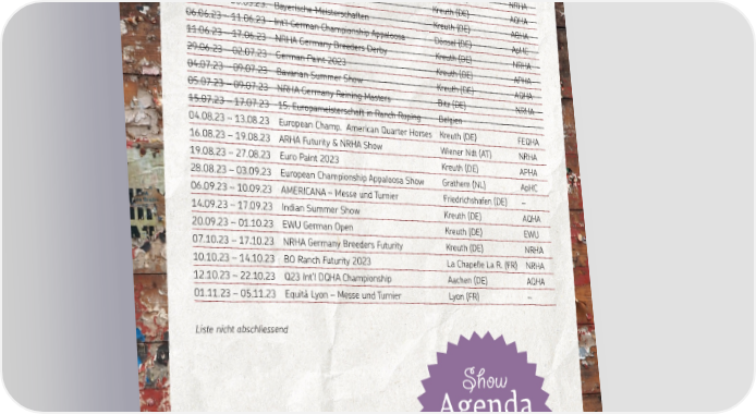 T URNIER AGENDA AUSLAND Da t u m Anlas s Ort 03.03.23 – 05.03.23 3-na tion sho w – Hor seAc adem y Moosla r gue (FR) NRHA 02.04.23 – 09.04.23 NRHA Germa n y Os t ert u rnier K r euth (DE) NRHA 11.04.23 – 16.04.23 Ba v a ria n Spring Clas sic K r euth (DE) AQHA 25.05.23 – 30.05.23. Ba y erische Meis t er schaft en K r euth (DE) AQHA 06.06.23 – 11.06.23 Int‘l Germa n Cha mpionship Appaloos a Dönsel (DE) ApHC 11.06.23 – 17.06.23 NRHA Germa n y Br eeder s Derb y K r euth (DE) NRHA 29.06.23 – 02.07.23 Germa n P aint 2023 K r euth (DE) APHA 04.07.23 – 09.07.23 Ba v a ria n Su mmer Sho w K r euth (DE) AQHA 05.07.23 – 09.07.23 NRHA Germa n y R eining Mas t er s Bitz (DE) NRHA 15.07.23 – 17.07.23 15. E u r opa meis t er schaft in R a nch R oping B 04.08.23 – 13.08.23 elgien E u r ope a n Cha mp. Americ a n Qua rt er Hor ses K r euth (DE) FEQHA 16.08.23 – 19.08.23 ARHA F ut u rity & NRHA Sho w Wiener Ndt (A T) NRHA 19.08.23 – 27.08.23 E u r o P aint 2023 K r euth (DE) APHA 28.08.23 – 03.09.23 E u r ope a n Cha mpionship Appaloos a Sho w Gr a them (NL) ApHC 06.09.23 – 10.09.23 AMERICANA – Mes se u nd T u rnier F ried richshaf en (DE) – 14.09.23 – 17.09.23 India n Su mmer Sho w K r euth (DE) AQHA 20.09.23 – 01.10.23 EWU Germa n Open K r euth (DE) EWU 07.10.23 – 17.10.23 NRHA Germa n y Br eeder s F ut u rity K r euth (DE) NRHA 10.10.23 – 14.10.23 BO R a nch F ut u rity 2023 La Cha pelle La R. (FR) NRHA 12.10.23 – 22.10.23 Q23 Int‘l DQHA Cha mpionship Aachen (DE) AQHA 01.11.23 – 05.11.23 E q uit à L y on – Mes se u nd T u rnier L y on (FR) – Lis t e nich t abschlies send Show A g enda zum A usdruck en