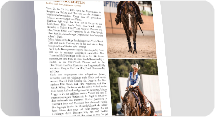 einem kleinen Apéro. Der eigentliche Vortrag startet anschliessend um 18:30 und endet um zirka 21 Uhr. Für ApHCS Mitglieder betragen die Kurskosten CHF 25.- und für Nicht-Mitglieder CHF 50.-. Tanja Karcher (tanja@appaloosa.ch) nimmt gerne eure Anmeldungen entgegen. Anmeldeschluss ist der 17.09.2023. Die Ausschreibung findet ihr auf unserer Homepage www.appaloosa.ch . SCHWEIZER MEISTERSCHAFT IM WESTERNREITEN Bericht: Sarah Stutz, Präsidentin ApHCS Vom 21. bis 23. Juli 2023 ritten die Westernreiter in Roggwil um Ruhm und Ehre und um die Schweizer- Meisterschaftsmedaillen. Unter den 66 gemeldeten Pferden waren 4 Appaloosa-Pferde. Delphine Egli zeigte ihre Stute Just In Excess in den Disziplinen Elite Ranch Trail, Elite/Youth Show- manship at Halter, Elite/Youth Western Pleasure und Elite/Youth Hunt Seat Equitation. In der Elite/Youth Hunt Seat Equitation belegte Delphine mit ihrer Stute den tollen 7. Platz. Selina Fahrni stellte Bops Strudel Pepper im Youth Ranch Trail und Youth Trail vor, wo sie den auch den 4. Rang belegten. Ebenfalls eine tolle Leitung! Auch Lydia Baumgartners elegante Stute Lopin My Asset Off war in mehreren Disziplinen anzutreffen. Ihre Trainerin Elif Schleiniger stellte sie in der Elite Horse- Foto: Lumikki Pictures manship, im Elite Trail, im Elite/Youth Showmanship at Halter, in der Elite/Youth Pleasure und in der Elite/Youth Hunt Seat Equitation vor. Ihr grösster Erfolg war der 6. Rang im Final der Elite/Youth Showmanship at Halter. Nach den vergangenen sehr erfolgreichen Jahren, versuchte auch ich wiederum mein Glück und nannte meinen Boemil Twin Decalog aka Loggy in den Dis- ziplinen Elite Ranch Rail, Elite Superhorse und Elite Ranch Riding. Nachdem wir den ersten Vorlauf in der Elite Ranch Rail noch völlig souverän meisterten, kriegte Loggy es im gut gefüllten zweiten Vorlauf mit den 20 zusammengelegten Pferden mit der Angst zu tun, als er dort mehrmals von mehreren Pferden gleichzeitig im Extended Lope und Extended Trot überrundet wurde. Ihn ängstigte bereits die Dynamik/Akustik der schnel- leren Pferde aber noch viel mehr ängstigte ihn das Geklimper deren Brustgeschirre, Bits und Buckles. Geräusche, die er wirklich alles andere als mag. Na gut, ich musste vorwärtsschauen, und das taten wir denn auch. Im Elite Superhorse und Elite Ranch zogen wir mit guten Platzierungen in den Final ein und wir behielten die Nerven auch im Final, so dass wir im Elite Superhorse die Bronzemedaille und im Elite Ranch Riding sogar die Goldmedaille mit nach Hause nehmen durfte. An dieser Stelle möchte ich mich ganz herzlich beim OK der SM bedanken und bei den vielen Sponsoren! In meinen beiden Klassen wurden die Medaillen und der Sieger-Buckle von der SWRA, vom Westerner und von Encodo Systems AG gesponsort. Vielen Dank! Foto: Lumikki Pictures Appaloosa Horse Club Switzerland August 2023 Enjoy the color ! . . 35