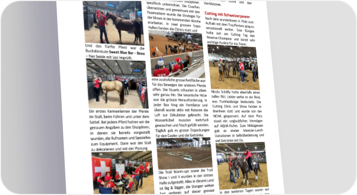 Hierzu ist ein Bild mit allen Youth aus Horseman und Horsewomen für die ausgelöst vom Staub und den Tamu WR Smartbalance – Biscuit – Save the Date! den laufenden Trainings zum YWC Pattern in den einzelnen Disziplinen Ventilatoren. unser Jungpferd im zugelosten Stall. entstanden. spezifisch unterrichtet. Die Coaches 18. – 21. Mai 2023 übersetzten und gemeinsam mit den Cutting mit Schweizerpower Teamreitern wurde die Strategie für Horsemanship Camp Nach dem wunderbaren 4. Platz zum die Shows in der kommenden Woche Matzendorf erarbeitet. In zwei grossen Expo- Auftakt mit dem Trauffertanz ging es sensationell weiter. Enie Büngen Hallen fanden die Clinics statt und 26. Juni – 8. Juli 2023 holte sich am Cutting Tag den Youth World Cup, Bryan, TX Reserve-Champion und damit sehr wichtige Punkte für das Team. Die sechs Jugendlichen haben seit 21. - 23. Juli 2023 Und das fünfte Pferd war die dem November 2022 bis zur heutigen SM Western, Roggwil BuckskinstuteSweet Blue Bar –Beau SQHA GV einen unglaublichen Spurt 04. - 13. August 2023 Anlässlich der SQHA GV wurde dieses – hier beide mit Lea Imgrüth. für die YWC-Kasse hingelegt. Dieses FEQHA European Championship, Bild amerikanisch versteigert und Engagement mit dem Youth Stand brachte der Youth-Kasse für den YWC geht nun weiter zum Warm-up in Kreuth 270.- ein. Holziken und an diverse andere Zum zweiten wird von jedem Team eine zusätzliche grosse Reitfläche war 16. + 17. September 2023 ein AQHA-YWC-Scrapbook verlangt. Anlässe. SQHA Futurity + Swiss Quarter Horse für das Bewegen der anderen Pferde Dieses Tagebuch zu unserer YWC- Auf diesem Weg herzlichen Dank an Show, Matzendorf offen. Die Stuarts schauten in allem Geschichte muss wiederum digital alle Sponsoren, Gönner und Nicola Schölly hatte ebenfalls einen sehr genau hin. Die texanische Hitze auf einen bestimmten Termin Spenden, die in den vergangenen tollen Ritt. Leider verlor er ein Rind, war die grösste Herausforderung. In abgegeben werden und darf fünf Wochen in unsere Youth-Kasse was Punkteabzüge bedeutete. Die jeder Box hing ein Ventilator und Minuten nicht überschreiten. Die gegeben wurden. Cutting Clinic und Show fanden in Ein erstes Kennenlernen der Pferde überall wurde aktiv mit Rotoren die Brenhem statt und wurde von der dritte Aufgabe ist ein Lip-Sync- Luft zur Zirkulation gebracht. Die im Stall, beim Führen und unter dem Wir sind sehr stolz, dass wir für die NCHA gesponsert. Auf dem Platz Contest, eine Präsentation zu einem Wasserkübel mussten mehrfach Sattel. Bei jedem Pferd hatten wir die SQHA am Youth World Cup teil- stand ein unglaubliches Vermögen Lied mit persönlicher Note aus dem gewaschen und frisch gefüllt werden. auf AQHA-Hufen. Zum Mittagessen genauen Angaben zu den Disziplinen, nehmen dürfen. eigenen Land. Hierzu wurde bereits Täglich gab es grosse Eispackungen gab es immer Mexican-Lunch- in denen sie bereits vorgestellt geprobt. für den Cooler und die Getränke. Variationen in Selbstbedienung und wurden, die Rufnamen und Spezielles Yolanda Facchin zum Equipment. Dann war der Stall viel Getränke mit Eis. zu dekorieren und mit der Planung Die Trail Warm-ups sowie die Trail Show I und II wurden in der dritten Halle aufgestellt. Alles in diesem Land ist Big & Bigger, die Stangen wirken fast verloren auf dieser grossen In den weiteren Tagen waren wir Zum Lied «Glöggele» von Trauffer Fläche. Mit den Pferden wurde sehr wieder in College Station in den für das Wochenende zu den ersten sorgsam geritten, da sie für die werden die ersten Tanzschritte verschiedenen Expo Hallen unter- Vorbereitungen mit den Disziplinen Teams zwölf Tage lang das ganze einstudiert, währenddessen auf dem wegs. Horsemanship, Reining, Equi- war dann der Tagesabschluss. YWC Programm «mitmachten». Flur der Youth Stand von fleissigen tation und Trail waren die nächsten Helferinnen vor der GV in Lenzburg Einige Teams hatten trotz Vorsicht Themen in den Clinics. Für die beiden Clinics für die Vorbereitung Ausfälle zu beklagen durch lahme ausgestellt wird. Show-Tage gab es unterschiedliche Während dem ersten Wochenende Pferde oder Augenentzündungen Pattern mit gutem Schwierigkeits- und an zwei weiteren Tagen wurden grad für die Reiter-Pferdepaare. die Teams von professionellen AQHA 50