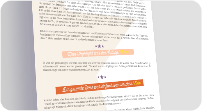 ZUR ÜBERSICHT YOUTH Lea Was für ein 䔀爀lebnis! Anfangs hatte ich Angst, dass wir Pferde haben, die wir gar nicht showen können oder gar nicht reitbar sind. Als wir zusammen als Team in die Stallgasse kamen, wusste ich, so schlecht konnte unser Los gar nicht gewesen sein, denn ich realisierte, dass «STERLING ASSETS» mein Pferd sein wird, da er das grösste von allen Pferde war. Ich freute mich sehr auf das erste Training mit «Sterling», um ihn näher kennenlernen zu können. Nach dem ersten Ritt war mir klar, ich habe das Pferd, das zu mir passt. Er hat mich sofort in sein Herz geschlossen, denn er wollte nie allein in der Stallgasse sein, lieber wollte er mit mir mitkommen und auch etwas trainieren. Bald war schon die erste Show – Trail. Ich freute mich sehr auf den Trail, da es auch meine Lieblingsdisziplin ist. Nach meinem ersten Ritt in der Show habe ich dann gemerkt, dass für «Sterling» Showen und Trainieren etwas anderes ist, weshalb es nicht immer einfach war ihn durch die Prüfung zu bringen. Wir haben alle Knackpunkte geübt, damit ich Schwie- rigkeiten in der Show besser lösen kann. So schweissten wir uns zu einem Dream-Team zusammen und konnten immer die Top 14 erreichen. Sogar von den Besitzern, welche vor Ort waren, habe ich ein grosses Lob erhalten, denn sie wissen, es ist nicht immer einfach mit «Sterling». Ich konnte super viel von den sehr freundlichen und hilfsbereiten Trainerinnen lernen. Alle wertvollen Tipps blei- ben immer in meinem Kopf verankert, denn es erinnert mich immer an die Zeit in Amerika. Dass wir zusammen den 7. Platz erreicht haben, macht mich sehr stolz auf unser Team. Nicola Mein Highlight war das Cutting! Es war ein grossartiges Erlebnis, von dem wir sehr viel pro昀椀tieren konnten. Es wurden neue Freundschaften ge- schlossen mit Leuten aus der ganzen Welt. Für mich war das Highlight das Cutting in Still Creek. Es war einer der tollsten Tage von dieser wunderschönen Zeit in Texas. Enie Die gesamte Reise war einfach wunderschön! Alleine schon das Auslosen der Pferde und die Eröffnungs-Zeremonie waren wirklich toll. Bei den ersten freien Trainings und Clinics haben wir dann die Pferde untereinander aufgeteilt und die Disziplinen festgelegt. Die Trai- ningstage haben wir dann intensiv genutzt, um die Pferde kennenzulernen. Am Montag war dann schon die erste Show in Cutting. Ich war so überwältigt, wie gut es gelaufen ist. Das Pferd, das ich geritten bin «ROAN TO DA BONE» hat wirklich alles gegeben. Eigentlich hatte ich überhaupt keine Erwar- tungen und habe mich dadurch natürlich umso mehr über den Reserve Champion Titel gefreut! Die nächsten Tage der Shows waren sehr abwechslungsreich, aber auch ziemlich stressig. Da hat man wirklich gemerkt, wie wir uns im Team unterstützt haben. Mit dem siebten Platz in der Team-Wertung bin ich mehr als zufrieden. Es ging durch die vielen Eindrücke einfach so schnell vorbei. Die Zeit beim Youth World Cup werde ich nie vergessen! Wir hatten viel Spass zusammen und konnten so viel erleben. 0823 YOUTH 19