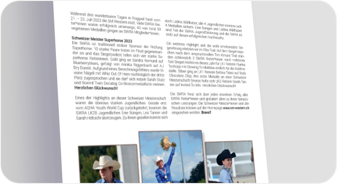 SWRA SPORT Erfolgreiche SM Western Während drei wunderbaren Tagen in Roggwil fand vom auch Ladina Wildhaber; alle 4 Jugendlichen konnten sich 21. – 23. Juli 2023 die SM Western statt. Viele SWRA Rei- 4 Medaillen sichern. Enie Büngen und Ladina Wildhaber ter*innen waren erfolgreich unterwegs; 43 von total 50 sind Teil der SWRA Jugendförderung und die SWRA ist vegebenen Medaillen gingen an SWRA Mitglieder*innen. stolz auf diesen erfolgreichen Nachwuchs. Schweizer Meister Superhorse 2023 Ein weiteres Highlight und die wohl emotionalste Sie- Die SWRA ist traditionell stolzer Sponsor der Prüfung gerehrung erlebten wir im Elite Trail. Auf dem Siegertrepp- Superhorse. 10 starke Paare traten im Final gegeneinan- chen nach dem anspruchsvollen Tim Kimura Trail stan- der an und das Siegerpodest teilen sich vier starke Su- den schliesslich 3 SWRA Reiter*innen: nach mehreren perhorse Reiterinnen. Gold ging an Sandra Remund auf fast-Siegen reichte es dieses Jahr für LK1 Reiterin Flurina Blueberryblues, gefolgt von Annika Riggenbach auf AJ Tschopp mit Glowing To Maliblue endlich für die Goldme- Dry Dunnit. Aufgrund eines Berechnungsfehlers wurde Vi- daille. Silber ging an LK1 Reiterin Bettina Trüeb auf Rods viane Nägeli mit Whiz Out Of Here nachträglich der dritte Chocolate Chip, ihre erste Medaille an einer Schweizer Platz zugesprochen und sie darf sich neben Sarah Stutz Meisterschaft! Bronze holte sich LK3 Reiterin Sarah Tan- und Boemil Twin Decalog Co-Bronzemedaillistin nennen. ner auf Invited To Win. Herzlichen Glückwunsch! Herzlichen Glückwunsch! Die SWRA freut sich über jeden einzelnen Erfolg aller Eines der Highlights an dieser Schweizer Meisterschaft SWRA Reiter*innen und gratuliert allen zu ihren fantasti- waren die überaus starken Jugendlichen. Gerade erst schen Leistungen. Die Schweizer Meister*innen und alle vom AQHA Youth World Cup zurückgekehrt, konnten die Resultate können auf der Homepage www.sm-western.ch SWRA LK2B Jugendlichen Enie Büngen, Lea Tanner und eingesehen werden. Bravo!! Sarah Höltschi überzeugen. Zu ihnen gesellen konnte sich Silbermedaille im Elite Superhorse für Annika Sandra Remund und Blueberryblues gewinnen Gold im Co-Bronzemedaille im Elite Superhorse für Riggenbach und AJ Dry Dunnit Elite Superhorse Viviane Nägeli und Whiz Out Of Here 5858
