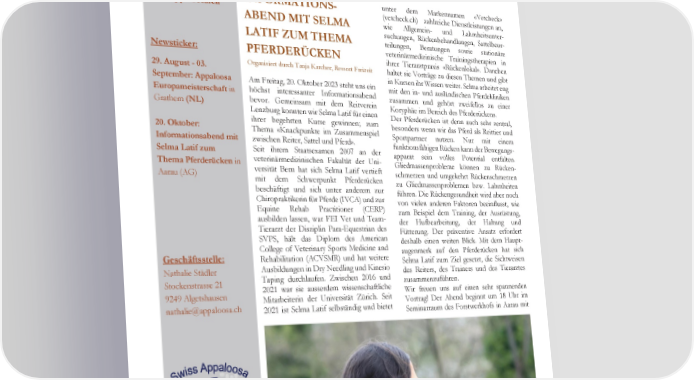› www.appaloosa.ch INFORMATIONS- unter dem Markennamen «Vetcheck» (vetcheck.ch) zahlreiche Dienstleistungen an, ABEND MIT SELMA wie Allgemein- und Lahmheitsunter- LATIF ZUM THEMA suchungen, Rückenbehandlungen, Sattelbeur- teilungen, Beratungen sowie stationäre Newsticker: PFERDERÜCKEN veterinärmedizinische Trainingstherapien in ihrer Tierarztpraxis «Rückenlokal». Daneben 29. August - 03. Organisiert durch Tanja Karcher, Ressort Freizeit haltet sie Vorträge zu diesen Themen und gibt in Kursen ihr Wissen weiter. Selma arbeitet eng September: Appaloosa Am Freitag, 20. Oktober 2023 steht uns ein mit den in- und ausländischen Pferdekliniken Europameisterschaft in höchst interessanter Informationsabend zusammen und gehört zweifellos zu einer Grathem (NL) bevor. Gemeinsam mit dem Reitverein Koryphäe im Bereich des Pferderückens. Lenzburg konnten wir Selma Latif für einen Der Pferderücken ist denn auch sehr zentral, 20. Oktober: ihrer begehrten Kurse gewinnen; zum besonders wenn wir das Pferd als Reittier und Thema «Knackpunkte im Zusammenspiel Sportpartner nutzen. Nur mit einem Informationsabend mit zwischen Reiter, Sattel und Pferd». funktionsfähigen Rücken kann der Bewegungs- Selma Latif zum Seit ihrem Staatsexamen 2007 an der apparat sein volles Potential entfalten. Thema Pferderücken in veterinärmedizinischen Fakultät der Uni- Gliedmassenprobleme können zu Rücken- Aarau (AG) versität Bern hat sich Selma Latif vertieft schmerzen und umgekehrt Rückenschmerzen mit dem Schwerpunkt Pferderücken zu Gliedmassenproblemen bzw. Lahmheiten beschäftigt und sich unter anderem zur führen. Die Rückengesundheit wird aber noch Chiropraktikerin für Pferde (IVCA) und zur von vielen anderen Faktoren beeinflusst, wie Equine Rehab Practitioner (CERP) zum Beispiel dem Training, der Ausrüstung, ausbilden lassen, war FEI Vet und Team- der Hufbearbeitung, der Haltung und Tierarzt der Disziplin Para-Equestrian des Fütterung. Der präventive Ansatz erfordert SVPS, hält das Diplom des American deshalb einen weiten Blick. Mit dem Haupt- College of Veterinary Sports Medicine and augenmerk auf den Pferderücken hat sich Geschäftsstelle: Rehabilitation (ACVSMR) und hat weitere Selma Latif zum Ziel gesetzt, die Sichtweisen Nathalie Städler Ausbildungen in Dry Needling und Kinesio des Reiters, des Trainers und des Tierarztes Stockenstrasse 21 Taping durchlaufen. Zwischen 2016 und zusammenzuführen. 9249 Algetshausen 2021 war sie ausserdem wissenschaftliche Wir freuen uns auf einen sehr spannenden nathalie@appaloosa.ch Mitarbeiterin der Universität Zürich. Seit Vortrag! Der Abend beginnt um 18 Uhr im 2021 ist Selma Latif selbständig und bietet Seminarraum des Forstwerkhofs in Aarau mit Foto: T. Aklin Appaloosa Horse Club Switzerland August 2023 Enjoy the color ! 3434