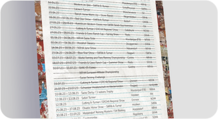 SCHWEIZ URNIER AGENDA T ein er V s Ort m Anlas u t Da orf WRC alt ehr F p u nch C a R A WR S y mit nch Da a R WRC 26.03.23 SPHA en Holzik rm Up a W SPHA 01.04.23 – 02.04.23 NRHA gue (FR) r Moosla Spring Slide NRHA 06.04.23 – 09.04.23 A WR S Schaffhausen rner u T D- A WR ern im Bild – S t es W 16.04.23 ein FM t nchens Mü rnier u erli T Läck 22.04.23 SRHA en t et t egens W nch a one R t rm Up – S a W se nch Hor a R 23.04.23 A WR Aadorf S rner u T A- A WR w – S Sho r a t ed S R 05.05.23 – 07.05.23 FM enches Av p u nch C a R A WR S sic mit ern Clas t es W m enticu Av 27.05.23 – 28.05.23 rn NCHA Solothu w egional Sho R / ERCHA rnier u T A- ting ut C 27.05.23 Nods SRHA w p – Spring Sho u nch C a ws R o riends & C F 27.05.23 – 28.05.23 NRHA gue (FR) r Moosla s Slide wis S NRHA 01.06.23 – 04.06.23 auggenried SRHA Z sics Mooshof Clas 03.06.23 – 04.06.23 endorf NRHA tz Ma w ne Sho Ju NRHA 16.06.23 – 18.06.23 A WR S wil ogg R rner u T A- A WR w – S Sho r a t Blue S 23.06.23 – 26.06.23 NRHA Givrins mpionship eining Cha a R r a nd P eining a orld R W 03.07.23 – 08.07.23 Nods SRHA w Sho mmer p – Su u nch C a ws R o riends & C F 08.07.23 – 09.07.23 NRHA Givrins sic CS Clas AG V S 10.07.23 – 15.07.23 mpionship e Cha t Af昀椀lia n a ope r u E NRHA eining Challenge s R wis S mmen NCHA E w egional Sho R / ERCHA rnier u T A- ting ut C 15.07.23 erbände V wil ogg R en eit ernr t es W im schaft er t Meis er eiz w Sch 21.07.23 – 23.07.23 NRHA gue (FR) r Moosla y oph r T tions y / 3 na s Derb wis S 10.08.23 – 13.08.23 FM en Holzik rnier u T ri a Saf 12.08.23 – 13.08.23 mmen NCHA E w egional Sho R / ERCHA rnier u T A- ting ut C 12.08.23 A WR S en Holzik rner u T A- A WR w – S se Sho Chaotic Hor 25.08.23 – 27.08.23 endorf NRHA tz eining Ma s / SM R er t eining Mas endorf R tz Ma 30.08.23 – 03.09.23 SRHA g y Riggisber seda whor o C 09.09.23 – 10.09.23 endorf SO SQHA tz Ma w se Sho Hor er rt s Qua wis rity & S u ut F SQHA 16.09.23 – 17.09.23 Nods SRHA w all Sho p – F u nch C a ws R o riends & C F 23.09.23 – 24.09.23 orf WRC alt ehr F p u nch C a R A WR S y mit nch Da a R WRC 01.10.23 mmen NCHA E mpionships s Cha wis S & NCHA rnier u T A ting ut C 07.10.23 w egional Sho R ERCHA A WR S enches Av rner u T D- A WR Bling – S e it Mak 14.10.23 NRHA gue (FR) r Moosla all Slide F NRHA 19.10.23 – 22.10.23