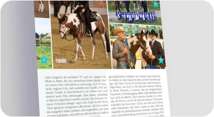 ZUR ÜBERSICHT WESTERN PEOPLE 2 4 5 3 6 Gabi fungierte als perfekter TT und ich ‘zappte’ von gesundheitliche Probleme mit seinem Immunsystem. Pferd zu Pferd, das war manchmal etwas haarig. Aber So haben wir den Fokus bei ihm auf das Ausreiten ge- wir waren über viele Jahre so unterwegs, auch im Aus- legt.» Mit ‘Dino’ durfte Fritz letztes Jahr viele schöne Er- land», ergänzt Fritz. Gabi verliebte sich im Jahr 2012 auf folge feiern, neu auch in der Disziplin Western Riding. einem Turnier in Deutschland in ein Fohlen-Foto und In dieser Disziplin zu starten, war ein langersehnter konnte auch Fritz überzeugen, dass dieses unbedingt Traum der in Erfüllung ging. Nebst Gold-Medaillen ziert in Natura angeschaut werden musste. Der Absetzer na- nun auch ein Master Zone Amateur Buckle von Ame- mens ‘Invitation Design’ zog in den Stall, wurde fortan rika die Vitrine und der Buckle als Amateur Champion ‘Dino’ genannt und gewann alle Herzen. «Er hatte schon anlässlich der Euro Paint. Glück und Leid sind oftmals als Jungpferd einen grossen Leistungswillen und man nahe beisammen. Bei ‘Dino’ wurde im Jahr 2020 am musste aufpassen, um nicht zu viel von ihm zu fordern, Augenlid ein Plattenkarzinom entdeckt, welches nach da er alles so perfekt mitmachte», erzählt Gabi. einer Laser-Behandlung verschwand, im Frühling 2022 wieder auftauchte und erneut behandelt wurde. «Aber Herzenspferd Dino nach der Europameisterschaft kam die Diagnose, das Fritz lobt den einmaligen, wunderbaren Charakter von Auge müsse entfernt werden, um noch eine Chance zu ‘Dino’, mit dem er so viele Erfolge feiern durfte. Spezi- haben. Wir haben der Operation zugestimmt, mit der ell war sicher die Halterprüfung, in der Gabi ‘Invitation Hoffnung, dass alles doch gut kommen sollte, zumal Design’ vorstellte und gewann, Fritz showte ‘CR Radical ‘Dino’ ja erst zehnjährig war. Er hatte sich davon gut er- Eyes’ und heimste den zweiten Rang ein. Fritz und Gabi holt, aber das Karzinom wuchs wieder. Wir haben noch reisten mit ihren ‘Jungs’ an etliche Turniere, fühlten sich jede Minute mit ihm genossen, mussten unser Her- auch in Deutschland immer herzlich willkommen: «In zenspferd aber Anfang Juli ziehen lassen, was uns sehr den vergangenen Jahren bekam ‘CR Radical Eyes’ dann schmerzt». 0823 WESTERN PEOPLE 7