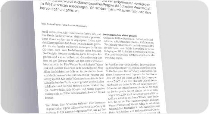 SPORT SM Western 2023 Ein Highlight der Schweizer Westernreit-Cummunity Bei schönstem Wetter und für Mensch und Tier einigermassen verträglichen Temperaturen, wurde in oberaargauischen Roggwil die Schweizer Meisterschaft im Westernreiten ausgetragen. Ein schöner Event mit gutem Sport und dazu hervorragend organisiert. Text: Andrea Fischer Fotos: Lumikki Photography Rund sechsundsechzig Teilnehmende haben sich und Der Palomino hats wieder gemacht ihre Pferde für die Schweizer Meisterschaft angemeldet. Gemeint ist DS Blue Diamond, der mit Besitzerin Sand- Zwar etwas weniger als in vergangenen Zeiten, doch ra Zahner auf Erfolgskurs ist. Das Paar wiederholte ihre den Klassengrössen hat dieser Umstand kaum gescha- Glanzleistung vom letzten Jahr und holte erneut Gold in det. Zu den bereits etablierten Prüfungen durfte das der Elite Hunter under Saddle. Ihnen gelang die Titelver- OK-Team noch zwei Medaillensätze mehr bestellen. teidigung vor Elif Schleiniger mit Onemoment Intyme, Die Disziplin Western Ranch Rail nahm Einzug ins Pro- Silber, und Sophie Gillioz mit Nachwuchspferd Its A Po- gramm und war auf Anhieb mit dreiundzwanzig Star- wer Thing, Bronze. tern bei der Elite gut belegt. Mit dem ersten Schweizer Meistertitel in der Elite Western Ranch Rail geht Tatjana Im Ausscheidungs- wie im Finallauf der zweiundzwan- Dul und Gunners Blue Hope in die Geschichte ein. Über zig Teilnehmer starken Trail-Prüfung zeigte sich Glowing Silber darf sich Bettina Galle mit Pistolero Bo Sun freuen To Maliblue unter Flurina Tschopp in Höchstform. Mit und die Bronzemedaille holt sich Annika Friesecke und einem Gesamtscore von 215 gewann das Paar Gold in AJ Dry Dunnit. Mit sechs Teilnehmerinnen konnte diese dem von Sport and Horses und Rojo Solo Cup gespon- Disziplin bei den Youth separat geführt werden. Ladina serten Elite Trail, vor Rods Chocolate Chip mit Bettina Wildhaber und ihr Pferd Mercury Motion jubelten über Trüeb (210) und Invited To Win mit Sarah Tanner (207). die Goldmedaille, Enie Büngen und Sierras Sugarboy Schwester Lea Tanner indessen räumte bei den Youth dürfen stolz auf Silber sein und Neela Rose mit Roi auf ab. Die Aargauerin, die erst kürzlich mit neuen Erfah- Bronze. rungen vom AQHA Youth World Cup aus den USA zu- rückkam, entschied mit ihrem Wallach Harley Invita- Wer denkt, dass Schweizer Meisterin Elite Showman- tion, die mit der Elite zusammengelegten Prüfungen ship at Halter Sophie Gillioz ohne ihre Stute Canny ali- Western Pleasure und Western Riding, für sich, ebenso as Power In The Canyon ausgepowert hat, war auf dem den Youth Trail. Das brachte ihr nicht nur drei Schweizer Holzweg. Sie verteidigte ihren Titel erfolgreich mit Its A Meistertitel, sondern auch noch den Allround Champi- Power Thing, Tochter der vom Turniersport pensionier- on bei den Youth ein. Reserve Allround schnappte sich ten Erfolgsstute. Silber verdienten sich Lea Sägesser und Enie Büngen mit Sierras Sugarboy. Enie holte Gold im I Really Like You und über Bronze freuten sich A Good Youth Ranch Trail, der Youth Ranch Riding und Silber in Sunset und Pia Schorno. der Youth Western Ranch Rail. I Really Like You bewies ihre Qualitäten erneut auch un- Keine Regel ohne Ausnahme oder eine Regel mit Aus- ter dem Sattel. Die achtjährige Quarter Horse Stute trug nahme? ihre Besitzerin in der Hunt Seat Equitation wie in der Man kann es drehen, wie man will, es änderte nichts am Western Horsemanship aufs Goldpodest. Punktegleichstand als es um die dritten Ränge in gleich zwei Prüfungen ging. So gibt es vermutlich die ersten 0823 SPORT 21
