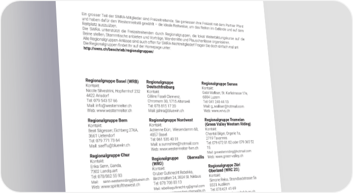 SWRA REGIONALGRUPPEN Regionalgruppen der SWRA Komm zu einer der Regionalgruppen der SWRA Ein grosser Teil der SWRA-Mitglieder sind Freizeitreitende. Sie geniessen ihre Freizeit mit dem Partner Pferd und haben dafür den Westernreitstil gewählt – die ideale Reitweise, um das Reiten im Gelände und auf dem Reitplatz auszuüben. Die SWRA unterstützt die Freizeitreitenden durch Regionalgruppen, die lokal Weiterbildungskurse auf die Beine stellen, Stammtische anbieten und Vorträge, Wanderritte und Plauschanlässe organisieren. Alle Regionalgruppen-Anlässe sind auch offen für SWRA-Nichtmitglieder! Fragen Sie doch einfach mal an! Die Regionalgruppen 昀椀ndet Ihr auf der Homepage unter: http://swra.ch/beschrieb/regionalgruppen/ Regionalgruppe Basel (WRB) Regionalgruppe Regionalgruppe Sursee Kontakt: Deutschfreiburg Kontakt: Nicole Silvestrini, Hopfernhof 232 Kontakt: Gabi Walliser, St. Karlistrasse 17e, 4422 Arisdorf Céline Fasel-Clemenz, 6004 Luzern Tel: 079 543 57 66 Chromem 30, 1715 Alterswil Tel: 041 240 44 13 Mail: info@westernreiter.ch Tel: 078 815 17 20 Mail: g_walliser@hotmail.com Web: www.westernreiter.ch Mail: jalma@bluewin.ch Web: www.wrvs.ch Regionalgruppe Bern Regionalgruppe Nordwest Regionalgruppe Tramelan Kontakt: Kontakt: (Green Valley Western Riding) Beat Sägesser, Eichberg 276A, Adrienne Dürr, Wiesendamm 68, Kontakt: 3661 Uetendorf 4057 Basel Chantal Bilger, Orgerie 1a, Tel: 079 771 73 64 Tel: 061 535 40 31 2719 Tavannes Mail: saeffu@bluewin.ch Mail: a.sunnshine@hotmail.com Tel: 079 672 01 82 oder 079 365 52 Web: www.westernreiter-fwn.ch 15 Regionalgruppe Chur Mail: gvwesternriding@hotmail.com Kontakt: Regionalgruppe Oberwallis Web: www.green-valley.ch Erika Senn, Ganda, (WRO) 7302 Landquart Kontakt: Regionalgruppe Züri Tel: 078/862 55 93 Gruber Gutknecht Rebekka, Oberland (WRC ZO) Mail: senn-westernriding@bluewin.ch Birchmatten 24, 3924 St. Niklaus Kontakt: Web: www.spiritofthewest.ch Tel: 078 708 03 13 Simone Reiss, Strandbadstrasse 5a Mail: rebekkagutknecht.rg@gmail.com 8331 Auslikon Regionalgruppe Schaffhausen Web: www.westernriders-oberwallis.ch Tel: 078 621 41 69 (Western RV Schaffhausen) Mail: info@westernreitclub-zo.ch Kontakt: Regionalgruppe SWHC Web: www.westernreitclub-zo.ch Dominique Fischer, Schönegg- Kontakt: strasse 25, 8212 Neuhausen Kaufmann Marion + Schmid Alena, Tel: 079 330 65 12 Holowistrasse 8D, 3902 Brig-Glis Mail: dominique昀椀scher@msn.com Tel: 078 710 42 84 Web: www.rvs.ch Mail: swhc@gmx.ch Web: www.swhc.ch 6565