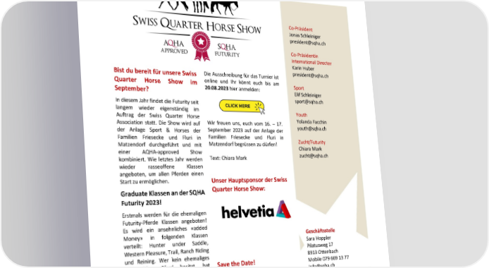 Hierzu ist ein Bild mit allen Youth aus Save the Date! den laufenden Trainings zum YWC entstanden. 18. – 21. Mai 2023 Horsemanship Camp Co-Präsident Matzendorf Jonas Schleiniger president@sqha.ch 26. Juni – 8. Juli 2023 Youth World Cup, Bryan, TX Co-Präsidentin International Director 21. - 23. Juli 2023 Die sechs Jugendlichen haben seit Karin Huber SM Western, Roggwil dem November 2022 bis zur heutigen president@sqha.ch Bist du bereit für unsere Swiss Die Ausschreibung für das Turnier ist Anlässlich der SQHA GV wurde dieses SQHA GV einen unglaublichen Spurt 04. - 13. August 2023 Quarter Horse Show im online und Ihr könnt euch bis am Sport Bild amerikanisch versteigert und für die YWC-Kasse hingelegt. Dieses FEQHA European Championship, 20.08.2023 hier anmelden: Elif Schleiniger September? Engagement mit dem Youth Stand Kreuth brachte der Youth-Kasse für den YWC geht nun weiter zum Warm-up in sport@sqha.ch 270.- ein. In diesem Jahr findet die Futurity seit Holziken und an diverse andere 16. + 17. September 2023 Zum zweiten wird von jedem Team langem wieder eigenständig im Anlässe. Youth ein AQHA-YWC-Scrapbook verlangt. SQHA Futurity + Swiss Quarter Horse Auftrag der Swiss Quarter Horse Auf diesem Weg herzlichen Dank an Yolanda Facchin Dieses Tagebuch zu unserer YWC- Wir freuen uns, euch vom 16. – 17. Show, Matzendorf Association statt. Die Show wird auf alle Sponsoren, Gönner und youth@sqha.ch Geschichte muss wiederum digital September 2023 auf der Anlage der der Anlage Sport & Horses der Spenden, die in den vergangenen auf einen bestimmten Termin Familien Friesecke und Fluri in Familien Friesecke und Fluri in Wochen in unsere Youth-Kasse Zucht/Futurity abgegeben werden und darf fünf Matzendorf begrüssen zu dürfen! Matzendorf durchgeführt und mit gegeben wurden. Chiara Mark Minuten nicht überschreiten. Die einer AQHA-approved Show zucht@sqha.ch dritte Aufgabe ist ein Lip-Sync- Text: Chiara Mark kombiniert. Wie letztes Jahr werden Wir sind sehr stolz, dass wir für die Contest, eine Präsentation zu einem wieder rasseoffene Klassen SQHA am Youth World Cup teil- Lied mit persönlicher Note aus dem angeboten, um allen Pferden einen nehmen dürfen. eigenen Land. Hierzu wurde bereits Start zu ermöglichen. Unser Hauptsponsor der Swiss geprobt. Quarter Horse Show: Graduate Klassen an der SQHA Yolanda Facchin Futurity 2023! Erstmals werden für die ehemaligen Futurity-Pferde Klassen angeboten! Es wird ein ansehnliches «added Money» in folgenden Klassen Geschäftsstelle verteilt: Hunter under Saddle, Sara Hoppler Western Pleasure, Trail, Ranch Riding Pilatusweg 17 und Reining. Wer kein ehemaliges 8913 Ottenbach einbezahltes Pferd besitzt, hat Save the Date! Mobile 079 669 13 77 trotzdem die Chance, in diesen 04. - 13. August 2023 info@sqha.ch Zum Lied «Glöggele» von Trauffer Klassen mitzumischen! Gegen einen FEQHA European Championship, werden die ersten Tanzschritte Aufpreis der Teilnahmegebühr Kreuth einstudiert, währenddessen auf dem können Quarter Horses ab dem Alter Flur der Youth Stand von fleissigen von 7 Jahren vorgestellt werden und 16. + 17. September 2023 Helferinnen vor der GV in Lenzburg attraktives Preisgeld gewinnen! Ihr SQHA Futurity + Swiss Quarter Horse ausgestellt wird. findet das Reglement zu den Show, Matzendorf Graduate Klassen hier: 52