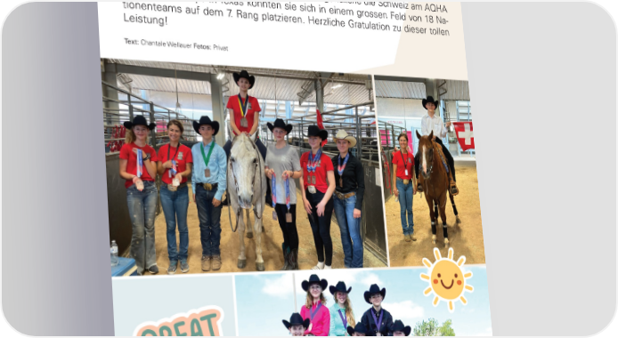 AQHA Youth World Cup Erfolgreiches Schweizer Youth Team in den USA Vom 29. Juni bis am 8. Juli vertraten sechs Jugendliche die Schweiz am AQHA Youth World Cup! In Texas konnten sie sich in einem grossen Feld von 18 Na- tionenteams auf dem 7. Rang platzieren. Herzliche Gratulation zu dieser tollen Leistung! Text: Chantale Wellauer Fotos: Privat WESTERNER 18