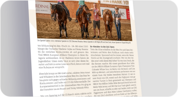 Die Speidel-Ladies: v.l.n.r. Adrienne Speidel mit CDC Chromed Resolve, Marisa Speidel mit All Mighty BB und Gatte Zsolt, Ariane Speidel mit Topsail Wimp BB ten Schlussrang bei den «Youth 14 – 18». Mit einer 218.5 Es «fonckte» in der EAC Open hängte der Tscheche Vladimir Cejka auf Remy Rooster Trotz der Hitze schafften es die Non Pro und Open Rei- SG die restlichen Konkurrenten ab und gewann den terinnen und Reiter dem Publikum noch etwas mehr Titel NRHA European Af昀椀liate Champion in dieser Ka- einzuheizen. Spannend wird es immer, wenn der Name tegorie wohlverdient. Es ist Vladimirs letzte Saison als Fonck auf der Anzeigetafel erscheint. Wer von den bei- Jugendlicher. Umso mehr freut er sich über dieses Re- den scort wohl dieses Mal höher? Es war Ann Fonck, die sultat und lobt in erster Linie sein Pferd, dem er erst mal das Rennen machte. Mit einem grandiosen Run holte eine Ruhepause verspricht. sie den NRHA Af昀椀liate European Open Champions Titel. Colonels Whize Gun, im Besitz von Hermann und Lisa Ebenfalls knapp an EM-Gold vorbei, «slidete» Peter Arnet Miltrup-Meinert, und seine Reiterin performten wie aus und Whizkers in der Intermediate Non Pro. Das Paar be- einem Guss. Die beiden beendeten Pattern 12 mit ei- hauptete sich gegen achtzehn Mitkonkurrentinnen und nem Score von 226, womit auch der Highscore vom ge- Konkurrenten und holte mit 213 die Silbermedaille. Der samten Turnier in Stein gemeisselt war. Ehemann und Europameistertitel in der Intermediate Non Pro ging an NRHA Two Million Dollar Rider Bernard Fonck hatte mit die Französin Laura Pouzol und Tricky Vobinda Whiz. Mello Yello Jersey und ND Pop Gun Trash gleich zwei Ei- sen im Feuer, schaffte es aber mit beiden nicht an CSG Wer am Samstag auf die CS Ranch reiste, erlebte nicht Piggiemove und dem Polen Lukasz Czechowicz vorbei, nur Temperaturen über der 30 Grad Marke, sondern der mit 224.5 abschloss und am Ende auf das Silberpo- auch Reining im Highscore-Level. Es «luftete» zwar dest kletterten. Fonck scorte zweimal 223.5 und holte immer ganz ordentlich und die Hitze liess sich in der Doppelbronze in der Open. Arena, mit den Traummassen von 95 x 50 Metern, gut aushalten. Und wer sich trotzdem etwas erfrischen Ein weiterer grosser Erfolg für Adrienne Speidel wollte, der holte sich einen kühlen Drink und fand auf Die Zürcherin aus Hombrechtikon hatte mit Wimpys- der grosszügigen Anlage garantiert ein schattiges und shortstride BB und ihrem Hengst CDC Cromed Resol- chilliges Plätzchen. Damit den Teilnehmenden mög- ve gleich zwei Pferde am Start. Sie legte beide Male mit lichst gleiche Voraussetzungen geboten werden können, einer 217.5 Top-Runs hin und führte zusammen mit wurde jeweils nach fünf Startern der Boden präpariert der Britin Francesca Sternberg und Red Dirt Paleface – Pausen gab es somit genügend. das EAC Non Pro Feld an. Wer auf die Drawlist schaute, WESTERNER 14