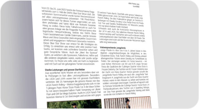 SWRA SPORT SWRA Blue Star Show in Roggwil BE Teilnehmerstarkes SWRA Saisonhighlight in der Reitsportarena Alle Fotos von Lumikki! Vom 23. Bis 25. Juni 2023 fand in der Reitsportarena Rogg- 25 weitere Paare durch. Ebenfalls sehr grosse Teilnahme- wil bereits zum 3. Mal die SWRA Blue Star Show statt. Bei felder gab es in der LK4A: 34 Paare hatten sich für die LK4A schönstem Sommerwetter wurde bester Westernreitsport Ranch Riding. Die drei Podesplätze gingen an Sabrina El- auf allen Leistungsniveaus präsentiert. 198 Pferd-Reiter- lenberger mit Cheeky Smokey Lena, Nadja Strub mit Prada paare haben sich für dieses Turnier angemeldet, um sich Cat Five und Sandra Rindlisbacher mit Mascotte jeweils dem prüfenden und fairen Blick von Richterin Susanne mit nur einem halben Punkt Abstand. Haug zu stellen. Diese hohe Teilnehmerzahl ist auch für Erfreulich sind auch die konstanten Klassengrössen in eine grosse Anlage wie die Roggwiler Reitsportarena eine der LK1A und LK2A. Die beliebten Klassen Ranch Riding, logistische Herausforderung, welche das SWRA Show Horsemanship und Trail dürfen sich auch in diesen beiden Team bestehend aus Carolin Steinmann, Jasmin Grossni- Leistungsklassen über Startfelder von über 20 freuen. Die klaus und Olivia Dauwalder dank eingespielter Zusammen- Leistungen sind stark und die Scores der Platzierten liegen arbeit und engagiertem Helferteam bravourös meisterte. sehr eng beieinander. Diese Blue Star Show war erneut für alle Beteiligten ein Erfolg. Es erreichten uns erneut sehr viele positive Feed- Vielversprechende Jungpferde backs, wir konnten viele zufriedene Gesichter sehen und Junge Pferde im Alter von 4 bis 6 Jahren haben in den gute Gespräche führen. Auch der „Meet the Sponsor“ eigenen Jungpferdeprüfungen die Möglichkeit, in den Apéro, an welchem alle Sponsoren, Teilnehmer, Helfer und Disziplinen Basis, Trail, Ranch Riding und Reining anhand alle anderen eingeladen waren, wurde sehr positiv aufge- altersgerechter Pattern einen Einstieg ins Turnierleben zu nommen. Es freute uns sehr, viele von Euch zu begrüssen 昀椀nden. Die Leistungen werden mit Noten bewertet – mit und mit Euch auf ein gelungenes Turnier anzustossen. zwei hohen Wertnoten von 8.0 und 8.25 zeigte Simone Reiss die Qualitäten der 5-jährigen Quarter Horse Stute A Starke Leistungen und grosse Startfelder Frozen Celebrity. Die Tochter von SG Frozen Enterprize aus Aus sportlicher Sicht freuten wir uns besonders über vol- der Zucht von Reiss Quarter Horses gewann sowohl die le Prüfungen in fast allen Leistungsklassen. Besonders Jungpferde Ranch Riding wie auch den Jungpferde Trail. die LK3A und LK4A waren hier mit grossen Startfeldern Insgesamt 4 Jungpferde aus der Zucht von Reiss Quarter vertreten. Mit 35 Nennungen die grösste Klasse war das Horses waren in den Klassen zu sehen und konnten mit LK3A Ranch Riding – Marisa Guggsiberg holte sich mit der soliden Leistungen überzeugen. Ebenfalls erfolgreich stell- 7-jährigen Paint Horse Stute Prada Cat 4 die blaue Schlei- te Stefanie Schäufele die 5-jährige Quarter Horse Stute LH fe mit einem knappen halben Punkt Vorsprung vor Liliane Prettiestlouintown, eine Tochter von A Sparkling Vintage, Fluri und OW Be Mega Surprise. Auch im LK3A Ranch Trail vor. Das Paar gewann die Jungpferde Reining und Basis konnten Marisa & Cat überzeugen und setzten sich gegen sowie die rote Schleife im Ranch Riding. Das erfolgreichste Ranch-Paar der LK3A: Allaround Champion LK3A: 5454 Marisa Guggisberg und Prada Cat Five Jana Padovan mit FS Bobbis Hollyjac