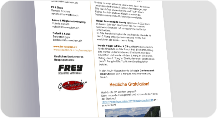 FM-WESTERN Gratulation zu den Erfolgen an den Der Vorstand Schweizermeisterschaften im Westernreiten Präsidentin Auch in diesem Jahr waren an den Judith Wittwer Schweizermeisterschaften im Westernreiten, die vom judith@fm-western.ch 20.-23. Juli 2023 in Roggwil stattfanden, einige Teilnehmerinnen mit ihren Freibergern am Start. Vizepräsidentin & Sport Sandra Remund Und sie mussten sich nicht verstecken, denn sie rockten sandra@fm-western.ch besonders die Paradedisziplinen der Freiberger, den Elite Ranch Trail sowie das Elite und Youth Ranch PR & Shop Riding. Auch in anderen Klassen konnten die Renate Trachsel Teilnehmerinnen tolle Platzierungen erreichen. renate@fm-western.ch Mirjam Brunner mit Sir Hendry konnte nach 2022 auch Kasse & Mitgliederbetreuung in diesem Jahr den Elite Ranch Trail nach einem Valerie Ferretti wunderschönen Ritt mit sehr gutem Score für sich valerie@fm-western.ch entscheiden. Im Elite Ranch Riding konnte das Paar die Medaille für Freizeit & Kurse den 3. Rang entgegennehmen und im Elite Trail Barbara Egger erreichten die beiden den 6. Rang. barbara@fm-western.ch Natalie Volger mit Nino X CH qualifizierte sich ebenfalls www.fm-western.ch für die Finalläufe im Elite Ranch Trail, Elite Ranch Riding, www.facebook.com/fm-western Elite Hunter under Saddle und Elite/Youth Hunt Seat Equitation und wurde mit dem 6. Rang im Elite Ranch Herzlichen Dank unseren Riding, dem 7. Rang im Elite Hunter under Saddle sowie Hauptsponsoren: dem 9. Rang im Elite/Youth Hunt Seat Equitation belohnt. In den Youth-Klassen konnte sich Aylin Greutmann mit Elmar CH über den 4. Rang im Youth Ranch Riding freuen. Herzliche Gratulation! Hast du die SM-Western verpasst? Dann nutze die Gelegenheit und schaue dir die Videos der Starts auf https://horseshow.video/?p=videosbyclass&id=44 an – es lohnt sich! Agenda FM-Western 2023 13. August Safari Turnier Holziken AG 15. September National FM Avenches VD 36