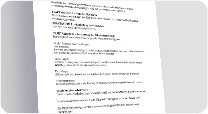 der Vorstand ist neu wie folgt aufgestellt: Adrienne Speidel, Präsidentin Stephanie Hasler, Vizepräsidentin Lilian Wohlgensinger Finanzverantwortliche Marc Preisig, Mitgliederverantwortlicher Fabian Strebel, Sportverantwortliche Sabrina Gujer, Kommunikationsverantwortliche. Sämtliche Vorstandsmitglieder haben die für das erfolgreiche Führen des Vereins notwendige Entscheidungsbefugnis und Kollektivunterschrift zu zweien. TRAKTANDUM 10 – Wahl der Revisoren Nadia Lattmann und Roger Winkler stellen sich ebenfalls zur Wiederwahl und werden einstimmig gewählt. TRAKTANDUM 11 – Entlastung des Vorstandes Der Vorstand wird einstimmig entlastet. TRAKTANDUM 12 – Festsetzung der Mitgliederbeiträge Der Vorstand sieht keine Änderungen der Mitgliederbeiträge vor. Es gibt folgende Wortmeldungen: Sven Friesecke: Die Höhe des Mitgliederbeitrags ist in Statuten festgelegt und müsste vorgängig traktandiert werden. Dies wird so aus juristischer Sicht von Andrea Waeber bestätigt. Daniel Geiger: Wie wäre es, kurzfristig einen Solidaritätsfonds zu eröffnen, beispielsweise jedes Mitglied bezahlt 100.00 ein, damit die Turniere kostendeckend werden. Vera Wenger: Es kann nicht sein, dass wir mit den Mitgliederbeiträge das Turnier der anderen finanzieren. Daniel Straumann: Beteuert nochmals, dass er der Meinung ist, dass die Mitgliederbeiträge erhöht werden müssen. Youth-Mitgliederbeiträge: Die Youth-Mitgliederbeiträge für das Jahr 2023 werden von Maurus Hasler übernommen. Sämi Schmid übernimmt die Youth-Mitgliederbeiträge für 2024. Herzlichen Dank. Die Mitgliederbeiträge werden angenommen. Es gibt 4 Stimmen dagegen und 2 Enthaltungen. TRAKTANDUM 13 – Anträge des Vorstandes und der Mitglieder Es sind innert der Frist weder von den Mitgliedern noch vom Vorstand Anträge an die Generalversammlung eingegangen. TRAKTANDUM 14 – Ernennungen und Ehrungen Es gibt keine Ernennungen oder Ehrungen in diesem Jahr. 2023 – NATIONAL REINING HORSE ASSOCIATION – NRHA.ch 34 W_NRHA_0423.indd 9W_NRHA_0423.indd 9 02.05.23 14:2602.05.23 14:26