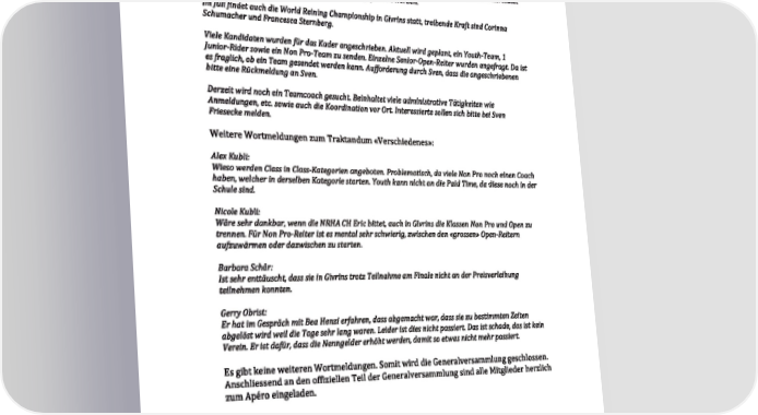 der Vorstand ist neu wie folgt aufgestellt: Adrienne Speidel, Präsidentin Stephanie Hasler, Vizepräsidentin Lilian Wohlgensinger Finanzverantwortliche Marc Preisig, Mitgliederverantwortlicher Fabian Strebel, Sportverantwortliche Sabrina Gujer, Kommunikationsverantwortliche. Sämtliche Vorstandsmitglieder haben die für das erfolgreiche Führen des Vereins notwendige Entscheidungsbefugnis und Kollektivunterschrift zu zweien. TRAKTANDUM 10 – Wahl der Revisoren Nadia Lattmann und Roger Winkler stellen sich ebenfalls zur Wiederwahl und werden einstimmig gewählt. TRAKTANDUM 11 – Entlastung des Vorstandes Der Vorstand wird einstimmig entlastet. TRAKTANDUM 12 – Festsetzung der Mitgliederbeiträge Der Vorstand sieht keine Änderungen der Mitgliederbeiträge vor. Es gibt folgende Wortmeldungen: Sven Friesecke: Die Höhe des Mitgliederbeitrags ist in Statuten festgelegt und müsste vorgängig traktandiert werden. Dies wird so aus juristischer Sicht von Andrea Waeber bestätigt. Daniel Geiger: Wie wäre es, kurzfristig einen Solidaritätsfonds zu eröffnen, beispielsweise jedes Mitglied bezahlt 100.00 ein, damit die Turniere kostendeckend werden. Vera Wenger: Es kann nicht sein, dass wir mit den Mitgliederbeiträge das Turnier der anderen finanzieren. Daniel Straumann: Beteuert nochmals, dass er der Meinung ist, dass die Mitgliederbeiträge erhöht werden müssen. Youth-Mitgliederbeiträge: Die Youth-Mitgliederbeiträge für das Jahr 2023 werden von Maurus Hasler übernommen. Sämi Schmid übernimmt die Youth-Mitgliederbeiträge für 2024. Herzlichen Dank. Die Mitgliederbeiträge werden angenommen. Es gibt 4 Stimmen dagegen und 2 Enthaltungen. TRAKTANDUM 13 – Anträge des Vorstandes und der Mitglieder Es sind innert der Frist weder von den Mitgliedern noch vom Vorstand Anträge an die Generalversammlung eingegangen. TRAKTANDUM 14 – Ernennungen und Ehrungen Es gibt keine Ernennungen oder Ehrungen in diesem Jahr. 2023 – NATIONAL REINING HORSE ASSOCIATION – NRHA.ch 2023 – NATIONAL REINING HORSE ASSOCIATION – NRHA.ch 35 W_NRHA_0423.indd 9W_NRHA_0423.indd 902.05.23 14:2602.05.23 14:26W_NRHA_0423.indd 10W_NRHA_0423.indd 10 02.05.23 14:2602.05.23 14:26