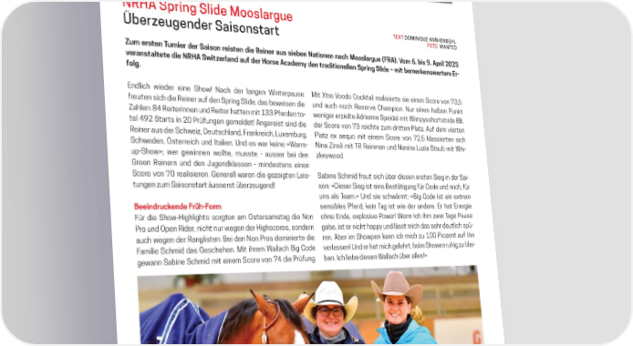 NRHA Spring Slide Moolrge Üeregender Sionr TEXT DOMINIQUE KRÄHENBÜHL FOTO WANTED Zum ersten Turnier der Saison reisten die Reiner aus sieben Nationen nach Mooslargue (FRA). Vom 6. bis 9. Aril eranstaltete die NRA S iterland au€ der orse Academ‚ den traditionellen Sring Slide – mit bemer„ens ertem …r† €olg. Endlich wieder eine Show! Nach der langen Winterpause šit œtra žoodo ›oc†tail realisierte sie einen Score ”on •ƒŸ freuten sich die Reiner auf den Spring Slide; das beweisen die und auch noch Reser”e ›hampion‹ Nur einen halben un†t Zahlen: 84 Reiterinnen und Reiter hatten mit ferden to weniger er‚ielte €drienne Speidel mit Wimp¡sshortstride ™™ƒ tel 4 Starts in rüfungen gemeldet! €ngereist sind die der Score ”on • reichte ‚um dritten lat‚‹ €uf dem ”ierten Reiner aus der Schwei‚ƒ „eutschlandƒ …ran†reichƒ ‡uˆemburgƒ lat‚ eˆ ae¢uo mit einem Score ”on •ƒŸ †lassierten sich Schwedenƒ Österreich und Štalien‹ Œnd es war †eine «Warm Nina Zinsli mit £R Reinman und Nanina ‡u‚ia Staub mit Whi upShow»; wer gewinnen wollteƒ musste ausser bei den ‚†e¡wood‹ ’reen Reinern und den “ugend†lassen mindestens einen Score ”on • realisieren‹ ’enerell waren die ge‚eigten ‡eis Sabine Schmid freut sich über diesen ersten Sieg in der Sai tungen ‚um Saisonstart äusserst über‚eugend! son: «„ieser Sieg ist eine ™estätigung für ›ode und michƒ für uns als £eam‹» Œnd sie schwärmt: «™ig ›ode ist ein eˆtrem Die Resultate ‡eeindruc„ende Früh†Form sensibles ferd; †ein £ag ist wie der andere‹ Er hat Energie Any Horse Any Rider 1 Any Horse Any Rider 2 …ür die Show—ighlights sorgten am ˜stersamstag die Non ohne Endeƒ eˆplosi”e ower! Wenn ich ihm ‚wei £age ause 1. Philipp Küng, Shine Maximum Shine, Score 72 1. Simon Bilger, Custom Freeze, Score 72, ro und ˜pen Riderƒ nicht nur wegen der —ighscoresƒ sondern gebeƒ ist er nicht happ¡ und lässt mich das sehr deutlich spü 1. Simon Bilger, Custom Freeze, Score 72 2. Œaniel Schmutz, enes Œeluxe, Score 72 auch wegen der Ranglisten: ™ei den Non ros dominierte die ren‹ €ber im Showpen †ann ich mich ‚u ro‚ent auf ihn . lex Kuli, unna u a, Score 71, . ˆilian †ohlgensinger, Spoo…s Martini, Score 71, …amilie Schmid das ’eschehen‹ šit ihrem Wallach ™ig ›ode ”erlassen! Œnd er hat mich gelehrtƒ beim Showen ruhig ‚u blei €. Saine Schmi‚, ƒtra „oo‚oo Coc…tail, Score 71 . ˆisa †inter, ‰usta ˆittle Cielo, Score 71, gewann Sabine Schmid mit einem Score ”on •4 die rüfung‹ ben‹ Šch liebe diesen Wallach über alles!» . Peter rnet, †hiz…ers, Score 7‡, . Peter rnet, †hiz M“ Frec…les, Score 71 . Melanie erer, ˆil ‰oe †hiz, Score 7‡, . ”lrich Koler, —instein ‚el Cielo, Score 71 S/H 5&Under Non Pro Rookie Level 1 1. Saine Schmi‚, Magic Šlena un, Score 7‡, 1. eecca Kieer, ™nšhizilegun, Score 7‡ 2. Sarina u‹er, Shining Œonna BB, Score Ž‘, 1. –ocola annis Schoell“, –Œ Miss „intager, Score 7‡ 2. amona ’ahn, Œa‚‚“ ”n‚erco•er, Score Ž‘, . „alentin Kun, Œunolenao•e“a, Score Ž˜, €. –ina Misteli, Francin Chic Œream, Score ŽŽ, €. Barara Fontanellaz, ol‚en ™ron ‰ac, Score Ž7, . ‰ana Knopi…, aga Š•er Berries, Score Ž €. Magali Bor‚ang, Kims Šlena Step, Score Ž7, €. Marianne ˆis›„aessen, u – Charming, Score Ž7, S/H 5&Under Open 1. B‹rn Bine…, otta †an‚a †oman, Score 7‡, Rookie Level 2 2. Œaniel Schmutz, ‰ess“s †il‚ un, Score 7‡ 1. Steanie Schauele, ˆ’Prettiestlouintošn, Score 7‡, 2. —•el“n . –epple, ‰ Mizzen Smo…eingun, Score 7‡ 2. amona ’ahn, Œa‚‚“ ”n‚erco•er, Score Ž˜, €. ‰osein ˆintner, Caspers Surprise, Score Ž˜, . eecca Kieer, FB Œr Fran…enstein, Score ŽŽ, €. Faien Boiron, Flash“ Face Œunnit, Score Ž˜, €. Marie Seuert, ƒtra Œun †imp“, Score ŽŽ €. ‰osein ˆintner, Œ „oo‚oo ose, Score Ž˜, €. ˆaila Stau, ƒtra „oo‚oo Creme, Score ŽŽ 2023 – NATIONAL REINING HORSE ASSOCIATION – NRHA.ch 2023 – NATIONAL REINING HORSE ASSOCIATION – NRHA.ch 2626 WESTERNER W_NRHA_0423.indd 1W_NRHA_0423.indd 1 02.05.23 14:2602.05.23 14:26 W_NRHA_0423.indd 2W_NRHA_0423.indd 2 02.05.23 14:2602.05.23 14:26