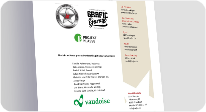 Hierzu ist ein Bild mit allen Youth aus Save the Date! Nicht weniger wichtig: unsere Mediensponsoren! Herzlichen Dank! den laufenden Trainings zum YWC entstanden. Co-Präsident 18. – 21. Mai 2023 Jonas Schleiniger Horsemanship Camp president@sqha.ch Matzendorf Co-Präsidentin 26. Juni – 8. Juli 2023 International Director Youth World Cup, Bryan, TX Karin Huber president@sqha.ch Die sechs Jugendlichen haben seit 21. - 23. Juli 2023 dem November 2022 bis zur heutigen SM Western, Roggwil SQHA GV einen unglaublichen Spurt Sport Elif Schleiniger Anlässlich der SQHA GV wurde dieses für die YWC-Kasse hingelegt. Dieses 04. - 13. August 2023 FEQHA European Championship, Bild amerikanisch versteigert und Engagement mit dem Youth Stand sport@sqha.ch brachte der Youth-Kasse für den YWC geht nun weiter zum Warm-up in Kreuth 270.- ein. Holziken und an diverse andere Youth Zum zweiten wird von jedem Team 16. + 17. September 2023 Anlässe. Yolanda Facchin ein AQHA-YWC-Scrapbook verlangt. SQHA Futurity + Swiss Quarter Horse Auf diesem Weg herzlichen Dank an youth@sqha.ch Dieses Tagebuch zu unserer YWC- alle Sponsoren, Gönner und Show, Matzendorf Geschichte muss wiederum digital Zucht/Futurity Und ein weiteres grosses Dankeschön gilt unseren Gönnern! auf einen bestimmten Termin Spenden, die in den vergangenen Chiara Mark abgegeben werden und darf fünf Wochen in unsere Youth-Kasse zucht@sqha.ch Minuten nicht überschreiten. Die gegeben wurden. Familie Achermann, Rotkreuz dritte Aufgabe ist ein Lip-Sync- Katja Vrecer, Küssnacht am Rigi Contest, eine Präsentation zu einem Wir sind sehr stolz, dass wir für die Rudolf Stähli, Seewil Lied mit persönlicher Note aus dem SQHA am Youth World Cup teil- Sylvie Niederhauser Jutzeler eigenen Land. Hierzu wurde bereits nehmen dürfen. geprobt. Gabriela und Fritz Herren, Wangen a.A. Janos Varga Yolanda Facchin Adolf Räz-Staub, Rapperswil Urs Bienz, Küssnacht am Rigi Yvonne Galli-Schölly, Kirchlindach Geschäftsstelle Sara Hoppler Pilatusweg 17 8913 Ottenbach Mobile 079 669 13 77 info@sqha.ch Zum Lied «Glöggele» von Trauffer Im Juni-Westerner werden wir unsere Silber- & Bronzesponsoren werden die ersten Tanzschritte sowie Sach- & Gutschein-Sponsoren verdanken. einstudiert, währenddessen auf dem Kennt Ihr schon unsere Webseite? Flur der Youth Stand von fleissigen Helferinnen vor der GV in Lenzburg ausgestellt wird. 44