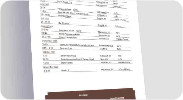 SWRA AGENDA 2023 Wann Was Wo Wer Mai 2023 5. - 7.05 Red Star Show Aadorf, TG SWRA A-Turnier 12.-14.05 Modul 4 Matzendorf, SO VT Ausbildung 16.-22.05 Perspektiv A+Q DS Coaching Kreuth, D JuFö 14.05 Brevet Gold Western SVPS Matzendorf, SO SWRA 28.05 SWRA Ranch Cup Avenches, VD FM Western Juni 2023 10.06 Perspektiv Trail – SVPS Matzendorf, SO JuFö 11.06 Basis RR und RT mit Markus Häberlin Müllheim-TG JuFö 22.- 25.06 Blue Star Show Roggwil, BE SWRA A-Turnier Juli 2023 21.- 23.07 SM Western Roggwil, BE Vereine August 2023 5.-6.08 Perspektiv RR/RN – SVPS Matzendorf, SO JuFö 20.08 Basis Pleasure und WRR Dürrenroth, BE JuFö 25.-27.08 Chaotic Horse Show Holziken, AG SWRA A-Turnier September 2023 10.09 Basis und Perspektiv Besuch Americana Friedrichshafen, D JuFö 20.9. - 1.10 German Open Kreuth, D EWU Oktober 2023 1.10 SWRA Ranch Cup Fehraltorf, ZH WRC 08.10 Basis Horsemanship mit Viviane Nägeli Seon, AG JuFö 14.10 Make it Bling Avenches, VD SWRA D-Turnier November 2023 3.-5.11 Modul 5 Matzendorf, SO VT Ausbildung Vorstand: Präsidentin / Academy Finanzen Jugendförderung Simone Reiss Karin Arrenbrecht Andrea Wildhaber simone.reiss@swra.ch karin.arrenbrecht@swra.ch andrea.wildhaber@swra.ch Sport Ausbildung Geschäftstelle SWRA Olivia Dauwalder Viviane Nägeli Swiss Western Riding Association olivia.dauwalder@swra.ch viviane.nägeli@swra.ch 3000 Bern -Tel. 032 510 31 31 Kommunikation, Marketing Geschäftstelle SWRA Geschäftstelle SWRA Barbara Schär Carolin Steinmann Jasmin Grossniklaus barbara.schaer@swra.ch info@swra.ch jasmin.grossniklaus@swra.ch 53