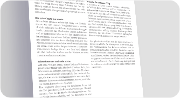 ZUR ÜBERSICHT HALTUNG chen ist eine schräge Kopfhaltung beim Fressen. Hier es Heu- oder Wiesencobs, die mit Wasser übergossen tut ihm möglicherweise auf der einen Seite des Mauls und gequollen verfüttert werden, oder entsprechend ein Zahn weh. zerkleinertes Futter. Es ist natürlich ein Mehraufwand und auch teurer als normales Heu, hat aber zusätzliche Ein Blick auf die Pferdeäpfel ist nie verkehrt Vorteile bei der Rationierung und ist staubfrei. Kotwasser, Durchfall und grobfaserige Pferdeäpfel kön- nen ein weiteres Indiz dafür sein, dass ein geschulter Wann ist der Zahnarzt fällig Blick ins Pferdemaul Klarheit bringen kann. Besonders, «Das kommt auf jedes einzelne Pferd an,» erklärt Tobi- wenn das Pferd bislang keine Probleme mit der Ver- as Widmer. Er ist Veterinär und hat sich komplett der dauung zeigte. In diesem Fall können sie das Heu nicht Zahnmedizin verschrieben. «Es gibt Pferde, deren Gebiss ganz zerkleinern, aber gerade noch gut genug, um es zu so perfekt ist, dass ich auch bei einem Intervall von zwei schlucken. Jahren nur wenig machen muss. Andere sind leider von Geburt an mit schlechten Zähnen ausgestattet. Grund- Der spinnt heute mal wieder sätzlich macht eine jährliche Kontrolle Sinn. Bevor man «Schon beim Zäumen wehrte sich Rocky und die Reit- das Pferd anreitet, genauer gesagt, bevor man ihm zum stunde war der Horror!» Rittigkeitsprobleme werden allerersten Mal eine Trense ins Maul legt, ist eine erste oft nicht sofort mit den Zähnen in Zusammenhang ge- Zahninspektion wichtig. Schlechte Erfahrungen beim bracht. Lässt sich das Pferd vorher ungern aufzäumen Einreiten, die mit einem Zahnproblem einhergehen und ist übel gelaunt, lohnt es sich den Kauapparat prü- können, werden so schon mal ausgeschlossen.» fen zu lassen. Ein weiteres Zeichen könnte übermässi- ges Speicheln sein, das kann allerdings auch auf eine Sportpferden kontrolliert man die Zähne am besten in Allergie, beispielsweise auf eine Metalltrense hindeuten. der zweiten Hälfte der Winterpause. Es ist üblich, dass Bei schon etwas weiter fortgeschrittenen Zahnproble- die Pferdezahnärzte ihre Patienten sedieren. Nur so men sind ein fauliger Geruch aus dem Maul oder gar können sie gute Arbeit verrichten, das Verletzungsrisi- ein übel riechender Ausfluss aus den Nüstern, ein ernst ko minimieren und schlechte Erfahrungen für das Pferd zu nehmendes Alarmzeichen. ausschliessen. «Haben sie einmal eine schlechte Erfah- rung gemacht, erinnern sie sich daran und machen im- Zahnschmerzen sind nicht schön mer schlechter mit.» Da eine Sedierung dopingrelevant Wer sein Pferd gut kennt, nimmt kleinste Veränderun- ist, sollte man eine Karenzfrist von bis zu sechs Wochen gen in seiner Mimik wahr. Pferde sind Meister darin, ihre einrechnen. Schmerzen zu ertragen. Empfängt dich dein Pferd nor- malerweise mit einem offenen Blick, aber heute mit Au- gen, die eher an eine durchzechte Nacht erinnern, dann könnten Schmerzen dahinterstecken. Ausser, es streifte mit seinen Kumpels ums Quartier. ;-) Eine ungleiche Abnutzung der Kauflächen kann mit der Zeit ganz fiese Zahnkanten hervorbringen. Sie sind so spitz, dass sie die Maulschleimhaut verletzen. Die- se Pferde fressen schlecht, weil das Kauen für sie sehr schmerzhaft ist. Lockere Zähne können ebenfalls schmerzen oder zu- mindest Unbehagen verursachen. Auf Pferde, die bereits einen oder gar mehrere Zähne verloren haben, emp- fiehlt es sich ein besonderes Augenmerk zu halten und die Fütterung zu optimieren. Auch mit Zahnlücken kön- nen Pferde, Ponys und Esel heute sehr alt werden. Die Futtermittelindustrie hat sich diesen Kandidaten ange- nommen und Heuersatzprodukte entwickelt, die eine entsprechende Rohfaseraufnahme gewährleistet. Seien 0523 HALTUNG 11