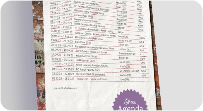T URNIER AGENDA AUSLAND Da t u m Anlas s Ort 03.03.23 – 05.03.23 3-na tion sho w – Hor seAc adem y Moosla r gue (FR) NRHA 02.04.23 – 09.04.23 NRHA Germa n y Os t ert u rnier K r euth (DE) NRHA 11.04.23 – 16.04.23 Ba v a ria n Spring Clas sic K r euth (DE) AQHA 25.05.23 – 30.05.23. Ba y erische Meis t er schaft en K r euth (DE) AQHA 06.06.23 – 11.06.23 Int‘l Germa n Cha mpionship Appaloos a Dönsel (DE) ApHC 11.06.23 – 17.06.23 NRHA Germa n y Br eeder s Derb y K r euth (DE) NRHA 29.06.23 – 02.07.23 Germa n P aint 2023 K r euth (DE) APHA 04.07.23 – 09.07.23 Ba v a ria n Su mmer Sho w K r euth (DE) AQHA 05.07.23 – 09.07.23 NRHA Germa n y R eining Mas t er s Bitz (DE) NRHA 15.07.23 – 17.07.23 15. E u r opa meis t er schaft in R a nch R oping B 04.08.23 – 13.08.23 elgien E u r ope a n Cha mp. Americ a n Qua rt er Hor ses K r euth (DE) FEQHA 16.08.23 – 19.08.23 ARHA F ut u rity & NRHA Sho w Wiener Ndt (A T) NRHA 19.08.23 – 27.08.23 E u r o P aint 2023 K r euth (DE) APHA 28.08.23 – 03.09.23 E u r ope a n Cha mpionship Appaloos a Sho w Gr a them (NL) ApHC 06.09.23 – 10.09.23 AMERICANA – Mes se u nd T u rnier F ried richshaf en (DE) – 14.09.23 – 17.09.23 India n Su mmer Sho w K r euth (DE) AQHA 20.09.23 – 01.10.23 EWU Germa n Open K r euth (DE) EWU 07.10.23 – 17.10.23 NRHA Germa n y Br eeder s F ut u rity K r euth (DE) NRHA 10.10.23 – 14.10.23 BO R a nch F ut u rity 2023 La Cha pelle La R. (FR) NRHA 12.10.23 – 22.10.23 Q23 Int‘l DQHA Cha mpionship Aachen (DE) AQHA 01.11.23 – 05.11.23 E q uit à L y on – Mes se u nd T u rnier L y on (FR) – Lis t e nich t abschlies send Show A g enda zum A usdruck en