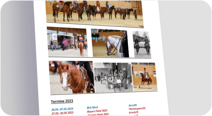 info@spha.ch • www.spha.ch ERSTE IMPRESSIONEN WARM UP Turnier 2023 Termine 2023 28.04.-07.05.2023 BEA Pferd Bern/BE 27.05.-30.05.2023 Bayern Paint 2023 Thierhaupten/DE 29.06.-02.07.2023 German Paint 2023 Kreuth/D 19.08.-27.08.2023 Euro-Paint 2023 Kreuth/D 23.09.2023 Herbstfest SPHA noch offen 08.10.2023 Futurity/APHA Show 2023 noch offen APHA Shows - sonstige Shows - Kurse – Events SPHA Hauptsponsoren 2023 41