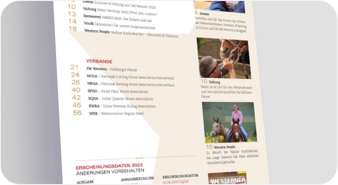 IN THIS ISSUE RUBRIKEN 2 In dieser Ausgabe 3 Editorial 7 USA Meilenstein für Gunnatrashya 8 Events Summer of Reining und SM Western 2023 8 Events 10 Haltung Wann benötigt mein Pferd den «Zahni»? Vorschau auf die Top-Events der schwei- 13 Sponsored AMERICANA: Die Tickets sind da! zer Westernreitszene. Sommer of Reining 14 Youth Saisonstart für unsere Jungmannschaft in Givrins und die SM Western in Roggwil. 16 Western People Nadine Rindlisbacher – Traumberuf Trainerin VERBÄNDE 21 FM Western – Freiberger Pferde 24 NCHA – National Cutting Horse Association Switzerland 10 Haltung 26 NRHA – National Reining Horse Association Switzerland Wann ist es Zeit für den Pferdezahnarzt 40 SPHA – Swiss Paint Horse Association und was sind die Anzeichen für Zahnpro- 42 SQHA – Swiss Quarter Horse Association bleme. 45 SWRA – Swiss Western Riding Association 56 WRB – Westernreiter Region Basel 16 Western People Zu Besuch bei Nadine Rindlisbacher. Die junge Trainerin hat ihren absoluten ERSCHEINUNGSDATEN 2023 Traumberuf gefunden. ÄNDERUNGEN VORBEHALTEN AUSGABE ANNAHMESCHLUSS ERSCHEINUNGSDATUM Juni 22.05.2023 02.06.2023 digital Juli Sommerpause August 24.07.2023 04.08.2023 digital en v September 28.08.2023 08.09.2023 digital Hea Oktober 25.09.2023 06.10.2023 digital mit November 23.10.2023 04.11.2023 digital Dezember 27.11.2023 08.12.2023 digital+druck iedmer ea Zehnder ea W Andr Andr ld: bi itel T Reiterin: WESTERNER 2