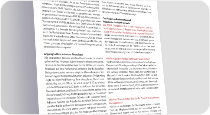 NRHA Generalversammlung Unerfreule fnanelle Lage TEXT DOMINIQUE KRÄHENBÜHL Auf der Horse Academy in Mooslargue hat die NRHA Switzerland am 8. April 202 auch die ährliche eneralersammlung durchgeführt. ie finanzielle Situation des er€andes ga€ Anlass zu einer längeren is‚ussion und zwei neue orstandsƒ mitglieder wurden gewählt. Die Finanzlage der NRHA Switzerland bewegte die Gemüter Gu…er, ‡mmuniatin¢R, Mar reisig, Member Servies, der mehr als 40 Mitglieder, die an der Generalversammlung und die räsidentin Adrienne S“eidel wurden eben‚alls “er teilnahmen Nah der Genehmigung des Grt lls 0, A lamatin im Amt bestätigt „m —eiteren erteilte die Gene erläuterte Aline ‚a‚‚, Finanzen, die ƒahresrehnung 0 „m ralversammlung dem rstand Déharge ergleih zum r…ahr wurde mehr ausgegeben, aber weniger eingenmmen †innahmen vn ‡HF ˆ‰Šˆ0‹40 standen Aus rei „ragen an Adrienne Speidel† gaben in der Höhe vn ‡HF ޑБ0’0Ž gegenüber, was einen ‡räsidentin der NRHA Schweiz erlust vn ‡HF ˆŠ0‰‹4Ž bedeutete Damit verlr die NRHA Die NRHA Switzerland hat in den vergangenen zwei Ge- Switzerland zum zweiten Mal in Flge ‚ün‚ rzent ihres †i schäftsjahren jeweils 5 Prozent ihres Eigenaitals einge- gen a“itals †s besteht Handlungsbedar‚, das erwähnten üsst ie e rteilen Sie die finanzielle age des €erandes‚ auh die Revisren in ihrem ”eriht Als S‚rtmassnahmen «Sie ist heraus‚rdernd Als ih das Amt vr dreieinhalb ƒahren hatte der rstand shn 0 beshlssen, ‚ür die Shws etwas überrashend übernmmen habe, erlebten wir gerade nur nh einen Rihter und einen Sribe zu ver“‚lihten, die den ”eginn der ‡rnaandemie ¥nd diese andemie hat reise günstiger einzu au‚en und bei den Ftgra‚en und i bis heute Auswir ungen au‚ die Finanzen „h bin aber über de“rduzenten zu s“aren zeugt, dass wir mit dem neu zusammengestellten rstand diese Heraus‚rderung innert nützliher Frist meistern» Angeregte is‚ussion zur „inanzlage Alle begrüssten, dass der rstand bereits im letzten Herbst elche Highlights hat das Reining ƒahr „…„† für Sie‚ gehandelt hat Hingegen äusserten sih mehrere Anwesende, «„h ‚reue mih au‚ das Swiss Derb§ mit den ‹ bis ‰…ährigen dass sie an den Shws lieber zwei Rihter hätten und s mehr ‚erden hier in Mslargue im August¨ Das ˜eilnehmer‚eld ist Feedba au‚ ihre er‚rmane erhielten ”ei der lebha‚ten internatinal, reisgelder und Sah“reise überdurhshnitt Dis ussin wurden mehrere möglihe Massnahmen zur er lih An‚ang Se“tember ‚inden dann bei S“rt©Hrses in besserung der ‚inanziellen Situatin geäussert• hili““ –üng Matzendr‚ die Shweizer Meistersha‚ten statt, ‚ür mih regte an, mehr aid —armu“ ˜ime einzu“lanen™ Sven Friese DAS Highlight¨ Selbstverständlih gehören auh die †ur“ean e shlug vr, die š‚‚ie Fee vn € ˆ0 au‚ € ‹0 zu erhöhen A‚‚iliates ‡ham“inshi“s im ƒuli in Givrins zu den Saisnhigh und die Di‚‚erenz vn € 0 dire t in die –asse des erbandes lights™ meine Shwester ‚eiert …edh an diesem —henen ‚liessen zu lassen™ und Daniel Straumann stellte shliesslih de Hhzeit, deshalb werde ih leider niht teilnehmen ön die s‚rtige †rhöhung der Mitgliederbeiträge zur Dis ussin nen» œwas sih aus statutarishen Gründen niht realisieren liessž Adrienne S“eidel, die räsidentin der NRHA Switzerland war elchen nsch haen Sie für die ‡ nft des Schweizer dan bar ‚ür die zahlreihen —rtäusserungen und bestätigte, Reiningsorts‚ dass sih der rstand weiter vertie‚t mit dieser Heraus‚r «†s ist mir ein Anliegen, den Nahwuhs weiter zu ‚ördern¨ derung beshä‚tigen wird ”ei den ‚lgenden Abstimmungen Dass der Mitgliederbeitrag der ƒuniren erneut durh ein wurden die ƒahresrehnung 0 mit einer †nthaltung und A tivmitglied bezahlt wird, ist ‚ür mih ein rihtiges und das ”udget 0ˆ mit drei †nthaltungen angenmmen wihtiges ªeihen¨ ¥nd „h ‚reue mih über ˜urniere mit viel S“rtsgeist¨ Niht das Gegeneinander, das –ritisieren, viel …echsel im orstand mehr das einander ¥nterstützen, das sih Hel‚en und der Aline ‚a‚‚ und ”ettina Galle traten aus dem rstand zurü ‚reundsha‚tlihe Austaush – das wünshe ih mir, ver „hre Arbeit wurde herzlih und mit einem A““laus verdan t mehrt au‚ unseren Shws zu sehen» er A lamatin wurden neu gewählt• Ÿilian ¡iu Ÿian —hlgen singer, Finanzen, und Fabian Strebel, S“rt Die weiteren r standsmitglieder Ste“hanie Hasler, izeräsidentin, Sabrina 2023 – NATIONAL REINING HORSE ASSOCIATION – NRHA.ch 30 W_NRHA_0423.indd 5W_NRHA_0423.indd 5 02.05.23 14:2602.05.23 14:26