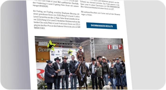 Cremona Italien, 28. Mär i . Aril NRA IRA IRBA ERB€ 2‚2ƒ TEXT SABRINA GUJER FOTO BONAGA Auch aus der Schweiz nahmen ein paar wenige Reiner mit ihren Pferden die vielen Kilometer unter die Räder, um sich mit den europäischen Top-Reinern in Italien zu messen Bei den Non Pros waren 142 Teilnehmer:innen am Start, wo- n der pen lasse waren 1‘Ž Teilnehmer genannt, aus der von Stephanie Blessing und ihre Stute SMAT SP S- S hwei‡ war niemand vertretenˆ –as ‚inale gewann in der PS si h ürs ‚inale in ƒevel „…4 †ualii‡iertenˆ ‰enalls pen ƒevel 4 ƒu”as‡ ™‡e howi ‡ mit ™S“ ‹SMAN‚A den ‚inalein‡ug in ƒevel „ gelang Peter Arnet mit seinem ›Besˆ atar‡œna oles”až mit einem S ore von 22Ÿˆ Šengst ‹ŠŒSˆ Alle weiteren esultate vom Turnier sind au dem Showma- Am ‚reitag, am ‚inaltag, errei hte Stephanie Blessing mit nager ‡u indenˆ einem grandiosen S ore von 21Ž,‘ ang „ in ƒevel 4 und in ƒevel „ errei hte sie den 2ˆ Plat‡ˆ Peter Arnet er‡ielte mit ei- ner 21’,‘ ang 12 in ƒevel „ˆ Šer‡li hen “lü ”wuns h an die ‰eiden• –er erste Plat‡ in ƒevel 4 mit einem S ore von 221,‘ SHOWMANAGER RESULTS ging ‰ei den Non Pros an den taliener —ittorio de ˜ulio mit M MA“™ ™Ššˆ 2023 – NATIONAL REINING HORSE ASSOCIATION – NRHA.ch 3636 W_NRHA_0423.indd 11W_NRHA_0423.indd 11 02.05.23 14:2602.05.23 14:26
