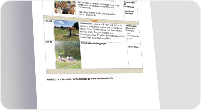 Unsere nächsten Aktivitäten Infos: www.westernreiter.ch Events & Vereinsanlässe 6.5. 23 Einsteiger Rinderkurs mit Silvan Schreiber Wegenstetten AG Der Vormittag ist reserviert für Einsteiger*innen in die Stone Ranch Rinderarbeit, sei dies Reiter*in oder Pferd. Max. 4Teilnehmende. Ausgebucht, Warteliste Nachmittags auch für bereits Erfahrene geöffnet. Max. 6 Teilnehmende Kurse 13.5.23 Naturtrailkurs : macht viel Spass und fördert das Reiterparadies Vertrauensverhältnis zwischen dem Menschen und Macriastein seinem Pferd. Die Hindernisse sind Baumstämme, Homepage Gräben, Wälle, Treppen, Brücken usw wrb Kursleitung : Susi Weiss Bei Schlechtwetter wird ein www.Westernre iter.ch Indoor Trail in der Halle angeboten Juli 23 Naturtrailkurs in Duggingen Details folgen Kontakt zum Vorstand: siehe Homepage www.westernreiter.ch 59