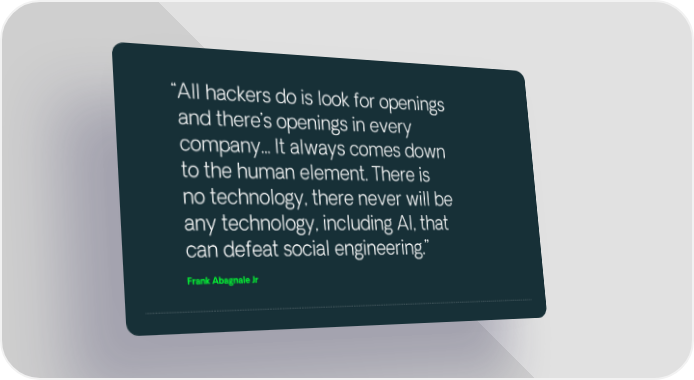 “ All hackers do is look for openings and there’s openings in every company... It always comes down to the human element. There is no technology, there never will be any technology, including AI, that can defeat social engineering.” Frank Abagnale Jr