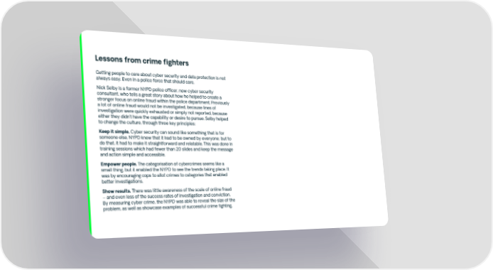Lessons from crime fighters Getting people to care about cyber security and data protection is not always easy. Even in a police force that should care. Nick Selby is a former NYPD police officer, now cyber security consultant, who tells a great story about how he helped to create a stronger focus on online fraud within the police department. Previously a lot of online fraud would not be investigated, because lines of investigation were quickly exhausted or simply not reported, because either they didn’t have the capability or desire to pursue. Selby helped to change the culture, through three key principles: Keep it simple. Cyber security can sound like something that is for someone else. NYPD knew that it had to be owned by everyone; but to do that, it had to make it straightforward and relatable. This was done in training sessions which had fewer than 20 slides and keep the message and action simple and accessible. Empower people. The categorisation of cybercrimes seems like a small thing, but it enabled the NYPD to see the trends taking place. It was by encouraging cops to allot crimes to categories that enabled better investigations. Show results. There was little awareness of the scale of online fraud – and even less of the success rates of investigation and conviction. By measuring cyber crime, the NYPD was able to reveal the size of the problem, as well as showcase examples of successful crime fighting.