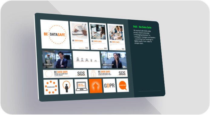WWW.SGS.COM BE DATA SAFE Data Privacy is a priority for SGS. We are committed to protecting customer and employee data in all parts of our business, to retain their trust and confidence for the long term. Learn more on www.sgs.com/privacy #BEDATASAFE WWW.SGS.COM BE DATA SAFE In an ever-increasing digital world, we are committed to protecting customer and employee data in all parts of our business. That is why we have created 3 commitments and 9 rules to help guide us in the way we treat any personal data. Find out more on http://bit.ly/SGSBeDataSafe #BEDATASAFE WWW.SGS.COM BE DATA SAFE Data Privacy is a priority for SGS. In an ever-increasing digital world, we are committed to protecting customer and employee data in all parts of our business. To help everyone understand what this means, we have now launched an e-learning module for all employees. Find out more on http://bit.ly/SGSBeDataSafe #BEDATASAFE 1 2 3 4 5 6 7 8 9 ARE YOU DATA SAFE? BE DATA SAFE MAKING OUR COMMITMENT TO DATA PRIVACY Find out more on www.sgs.com/privacy BE DATA SAFE FIND OUT MORE ABOUT OUR GLOBAL DATA PRIVACY POLICY www.sgs.com/privacy SGS - Be Data Safe We worked with SGS’s data privacy team to develop a messaging playbook, for colleagues, managers and leaders - everything from briefings to digital assets, from video to escape room.