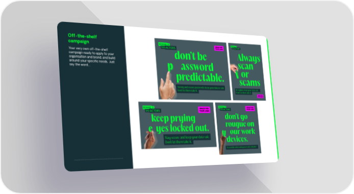Always scan for scams f Be vigilant. Keep your data safe. Don’t let them take it. p don’t be password predictable. Strong and secure passwords keep your data is safe. Don’t let them take it. keep prying eyes locked out. e Stay secure and keep your data safe. Don’t let them take it. don’t go rougue on your work devices. y Be sensible when using your work computer. Off-the-shelf campaign Your very own off-the-shelf campaign ready to apply to your organisation and brand, and build around your specific needs. Just say the word…