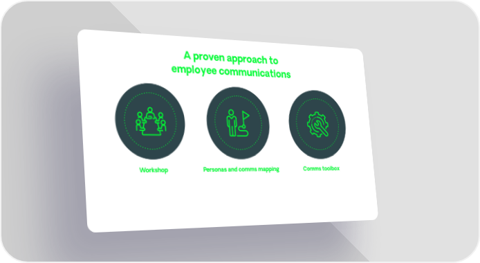 Comms toolbox A toolbox of relevant assets to use across your organisation. Personas and comms mapping Mapping comms strategy according to personas, and specific context of organisation and its people. Workshop Half-day workshop to work through the challenges. Up to 3x calls with key stakeholders prior to workshop to provide context. A proven approach to employee communications
