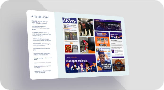 Arriva Rail London Rebuilding trust through more effective comms Lack of trust in leadership, exacerbated by Covid and strike action A strategic review of comms to understand how to build trust and engage colleagues 106 ran workshops and micro conversations across the network Developed ‘5 to drive’ strategy to focus communications Visible leadership central to the plan Now a board-level agenda item and part of leadership KPIs Manager briefings – the power of three Visits to intranet rose by 400% Email opens increased by more than 50% Leadership meetings now held across the network