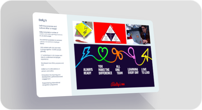 Bally’s Defining purpose and culture after a merger Bally’s acquired a number of casino and online gaming business in US and Europe No common purpose; no common culture; no common employer brand 106 worked with CEO and HRD to bring together 10,000 people globally 17 workshops in US, Europe and Asia to understand employee experience Developed new DNA, purpose and EVP Rolled out to all locations, in person and online Embedded into learning and development, performance and engagement Supported by international recognition programme
