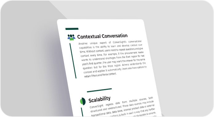 Contextual Conversation Another unique aspect of ConverSight’s conversational capabilities is the ability to learn and develop context over time. Without context, users need to repeat questions and give context every time. For example, if the procurement leader wants to understand shortages from the East region for last year’s first quarter, the user may want the answer for the same question but for the West region. Athena understands the context and applies it automatically. Users also have options to retain filters and force context. Scalability ConverSight ingests data from multiple sources, both structured and unstructured. These data sources may include transactional data, data lakes, internal product data or external data feeds. The platform is built in such a way that any further addition or changes into the data like vehicle models & variants, sales, forecast, plan changes, supplier & part changes are easily comprehended, making the solution highly flexible and scalable on-the-go with the least possible lag and effort. www.conversight.ai 8
