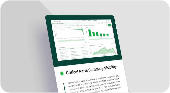Critical Parts Summary Visibility ConverSight enables automation of dashboards by supplier, day, region, model and ship for a holistic detailed status of each part. Further drill down capabilities allow users to understand more about the critical parts at the click of a button. Such dashboards are easily configured as needed by the roles to filter out non- relevant information. The manual tasks involved during preparation of these dashboards is completely eliminated with ConverSight. Easily prepare, save and share dashboards within minutes. This simple re-configuration allows more flexibility and much needed time to respond at all levels of the organization. www.conversight.ai 5