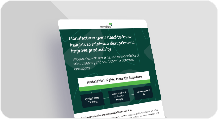 Manufacturer gains need-to-know insights to minimize disruption and improve productivity Mitigate risk with real-time, end-to-end visibility on sales, inventory and distribution for optimized operations Actionable Insights. Instantly. Anywhere Automated and Conversational Critical Parts Actionable AI Tracking Insights On-Time Production Insurance With The Power of AI A prominent Automobile OEM managing 40 facilities across the globe, manufacturing & selling ~450,000 commercial vehicles needed to gain better visibility on sales, inventory and distribution to understand unavailability of critical parts and supplier delays. One of the biggest challenges in highly dynamic supply chain environments is the threat of potential supply disruption. According to MHI-Deloitte research that surveyed 1000 organizations, 74% of the leaders have expressed shortages and supply chain disruptions as an extreme to very extreme risk. The client had developed a manual process for assessing materials risk against short-term production plans (7 to 14 days). The process proved quite effective and soon became the vital input for planning and controlling the entire production. A primary component of the organization’s planning was based on the inputs of a report called “Critical Parts Summary”. The dependency was so high on the report that the entire SCM and production team would struggle to smoothly execute plans in absence of the report. It also required a well crafted input/output process for smooth functioning and collaboration among the various users. www.conversight.ai 1