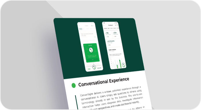Conversational Experience ConverSight delivers a unique, patented experience through a conversational AI. Users simply ask questions to Athena using terminology already in use by the business. This one-to-one interaction helps users diagnose data, investigate information from different perspectives, and create dashboards instantly. The information and data is then presented by Athena in meaningful visual formats such as charts, tables, pivot, Gantt, and calendar charts.This conversational interface is a key differentiator of ConverSight, encouraging enhanced collaboration and speeding critical and long-term decision making. Once Athena answers a question, the user is then presented a list of related questions or follow up actions to consider. This enables the user to be proactive and allows for easy exploration of data sets. www.conversight.ai 7