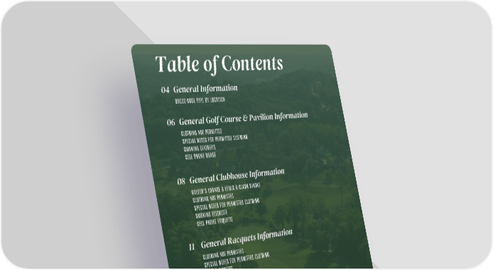 Table of Contents General Golf Course & Pavilion Information CLOTHING NOT PERMITTED SPECIAL NOTES FOR PERMITTED CLOTHING SMOKING ETIQUETTE CELL PHONE USAGE 04 06 General Information DRESS CODE TYPE BY LOCATION General Clubhouse Information GOLFER’S LOUNGE & LEWIS & CLARK DINING CLOTHING NOT PERMITTED SPECIAL NOTES FOR PERMITTED CLOTHING SMOKING ETIQUETTE CELL PHONE ETIQUETTE 08 General Racquets Information CLOTHING NOT PERMITTED SPECIAL NOTES FOR PERMITTED CLOTHING COURT ETIQUETTE 11 General Aquatic Information CLOTHING NOT PERMITTED SPECIAL NOTES FOR PERMITTED CLOTHING UNDERAGE CHILDREN & MINORS POLICIES SMOKING AREA CELL PHONE USAGE 13 Dress Code Examples MENS GOLF MENS CASUAL MENS SEMI-FORMAL MENS FORMAL LADIESS GOLF LADIES CASUAL LADIES SEMI-FORMAL LADIES FORMAL RACQUETS ATTIRE AQUATIC ATTIRE DENIM POLICY 15