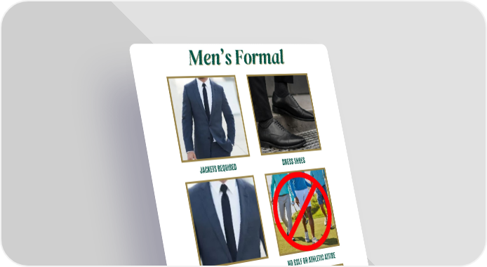 Dress Code Flipbook Page 19 Page 21PAGE 20 Men’s Formal Men’s Formal JACKETS REQUIRED DRESS SHOES N D i N C g Sh t TIES REQUIRED NO GOLF OR ATHLETIC ATTIRE NO HATS NO OPEN TOED SHOES