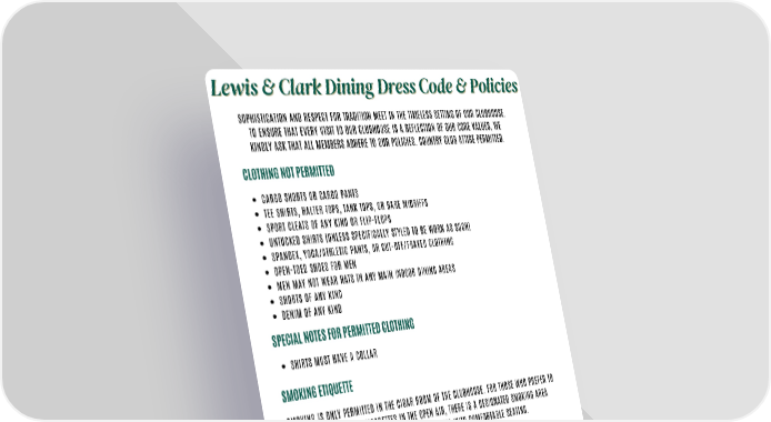 PAGE 10 Lewis & Clark Dining Dress Code & Policies Lewis & Clark Dining Dress Code & Policies CARGO SHORTS OR CARGO PANTS TEE SHIRTS, HALTER TOPS, TANK TOPS, OR BARE MIDRIFFS SPORT CLEATS OF ANY KIND OR FLIP-FLOPS UNTUCKED SHIRTS (UNLESS SPECIFICALLY STYLED TO BE WORN AS SUCH) SPANDEX, YOGA/ATHLETIC PANTS, OR CUT-OFF/FRAYED CLOTHING OPEN-TOED SHOES FOR MEN MEN MAY NOT WEAR HATS IN ANY MAIN INDOOR DINING AREAS SHORTS OF ANY KIND DENIM OF ANY KIND CLOTHING NOT PERMITTED SOPHISTICATION AND RESPECT FOR TRADITION MEET IN THE TIMELESS SETTING OF OUR CLUBHOUSE. TO ENSURE THAT EVERY VISIT TO OUR CLUBHOUSE IS A REFLECTION OF OUR CORE VALUES, WE KINDLY ASK THAT ALL MEMBERS ADHERE TO OUR POLICIES. COUNTRY CLUB ATTIRE PERMITTED. SHIRTS MUST HAVE A COLLAR SPECIAL NOTES FOR PERMITTED CLOTHING SMOKING IS ONLY PERMITTED IN THE CIGAR ROOM OF THE CLUBHOUSE. FOR THOSE WHO PREFER TO ENJOY THEIR CIGARS OR CIGARETTES IN THE OPEN AIR, THERE IS A DESIGNATED SMOKING AREA OUTSIDE OF THE 19TH HOLE ON THE VERANDA, COMPLETE WITH COMFORTABLE SEATING. SMOKING ETIQUETTE WHILE DINING AT THE CLUB, WE KINDLY REQUEST THAT YOU REFRAIN FROM USING YOUR CELL PHONE IN THE MAIN DINING AREAS. PERMISSIBLE AREAS FOR CELL PHONE USAGE INSIDE THE CLUBHOUSE INCLUDE THE 19TH HOLE, LADIES CARD ROOM, GOLF SHOP, AND OUR LOCKER ROOMS. IF YOU RECEIVE A CALL DURING DINNER, WE APPRECIATE YOUR UNDERSTANDING IN EXCUSING YOURSELF TO ONE OF THESE DESIGNATED AREAS. CELL PHONE ETIQUETTE