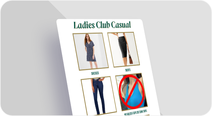 PAGE 22 Ladies Club Casual Ladies Club Casual DRESSES SKIRTS N D i N C g Sh t APPROPRIATE DENIM NO HALTER TOPS OR TANK TOPS NO DENIM SHORTS NO FLIP-FLOPS